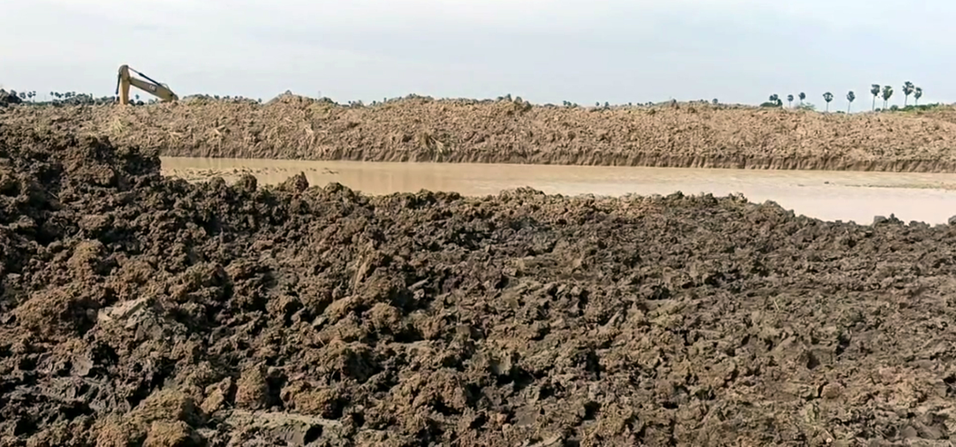 செஞ்சி கிராமத்தில் ஏரியின் நடுவில் பெட்டி பெட்டியாக ஆழப்படுத்திய ஹிட்டாச்சி எந்திரங்களை பணி செய்யவிடாமல் தடுத்து நிறுத்தி சமமாக தூர்வார பொதுமக்கள் கோரிக்கை :