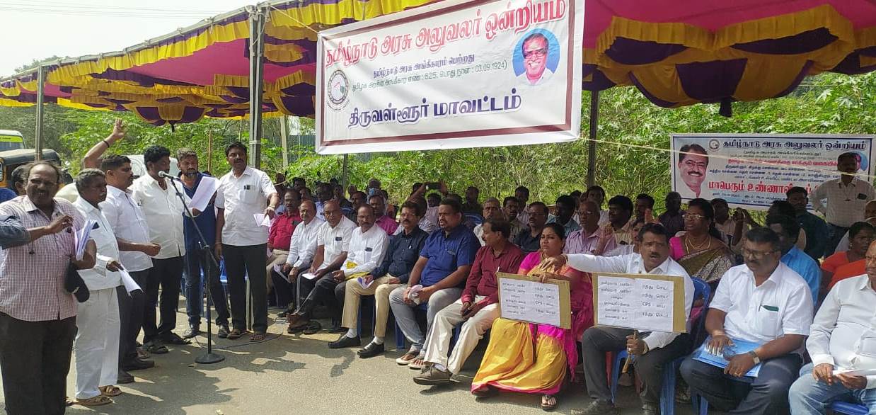 திருவள்ளூர் மருத்துவ கல்லூரி அருகே தமிழ்நாடு அரசு அலுவலர் ஒன்றியம் சார்பில் 25 அம்ச கோரிக்கைகளை வலியுறுத்தி உண்ணாவிரத போராட்டம்