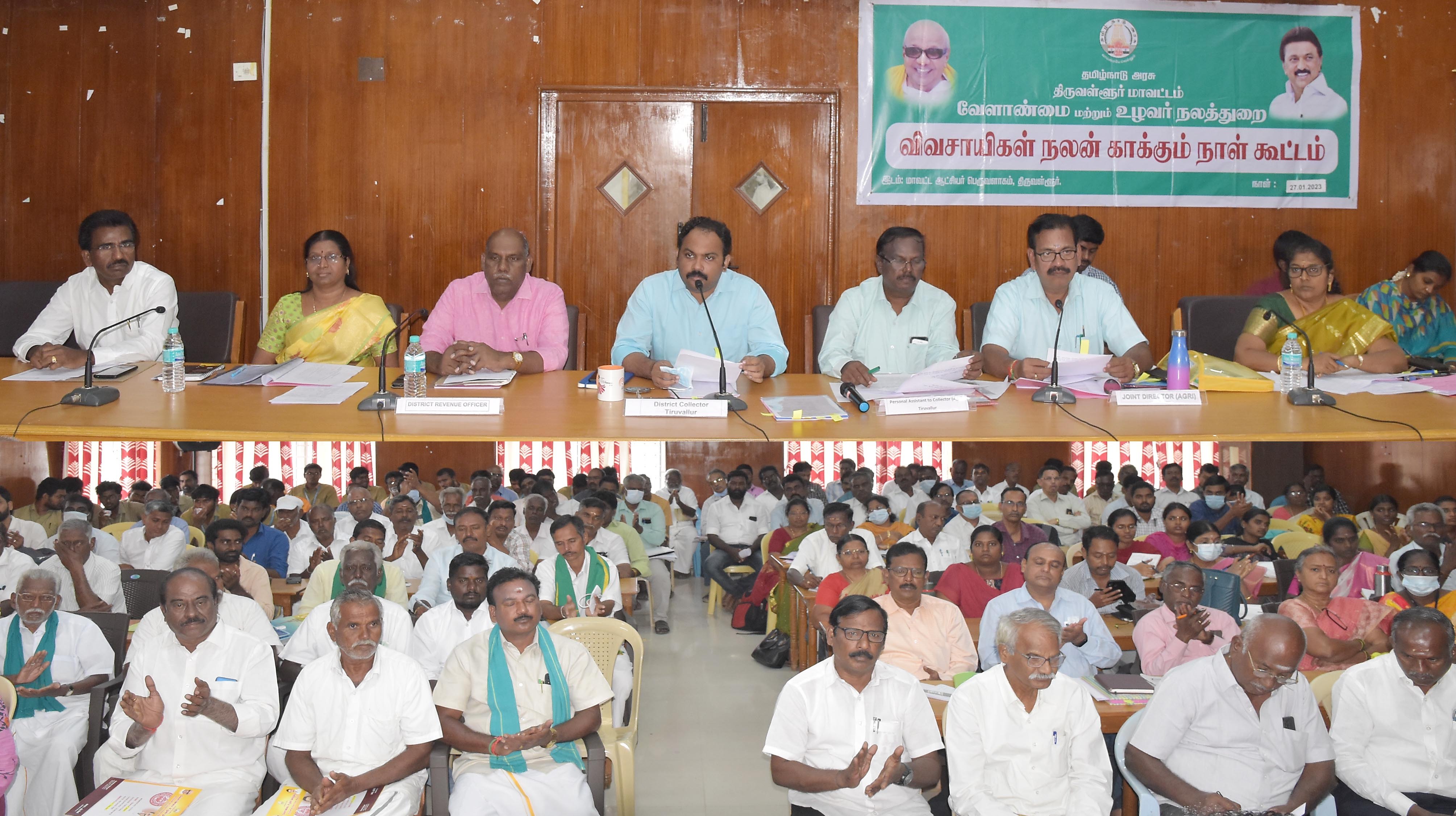 திருவள்ளூர் மாவட்ட ஆட்சியர் அலுவலக கூட்டரங்கத்தில், வேளாண்மை - உழவர் நலத்துறை சார்பாக விவசாயிகள் நலன் காக்கும் நாள் கூட்டம்