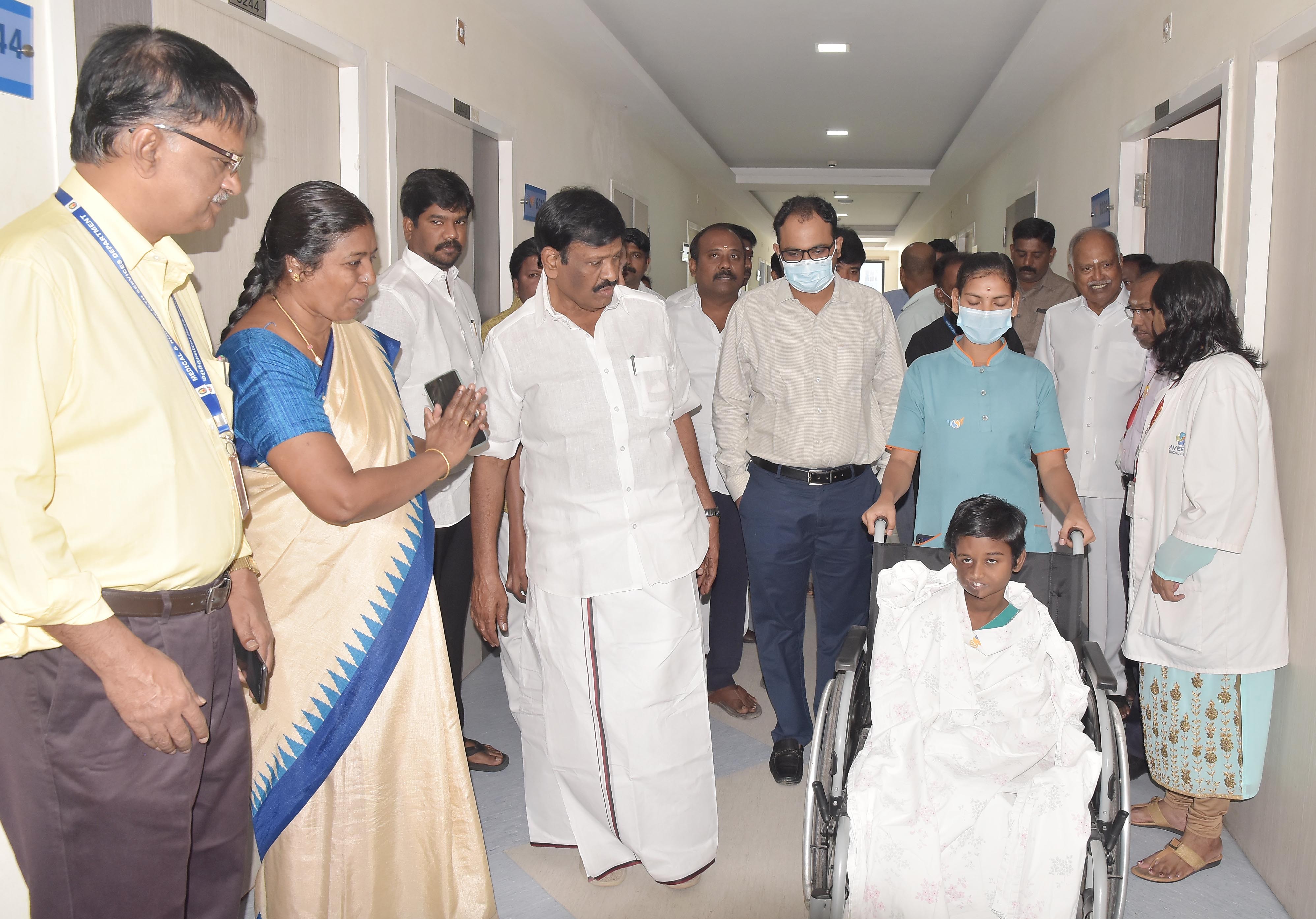 முக சிதைவு நோயால் பாதிக்கப்பட்ட டேனியா என்ற சிறுமியை பால்வளத்துறை அமைச்சர் சா.மு.நாசர் நலம் விசாரித்து கூடுதல் அறுவை சிகிச்சை மேற்கொள்வதற்காக வழி அனுப்பி வைத்தார் :