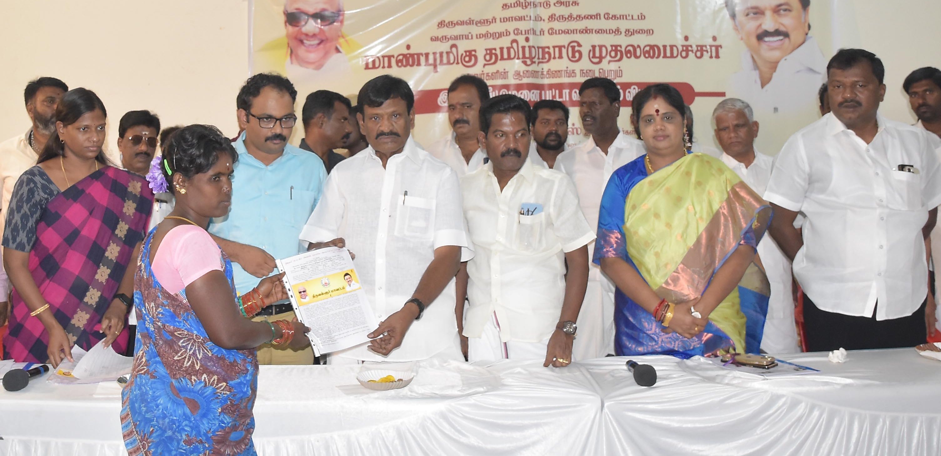 திருத்தணி, ஆர்.கே.பேட்டை, பள்ளிப்பட்டு ஆகிய வட்டங்களுக்குட்பட்ட 227 குடும்பங்களுக்கு சுமார் ரூ.2.10 கோடி மதிப்பீட்டில் இலவச வீட்டு மனை பட்டாக்கள் : பால்வளத்துறை அமைச்சர் சா.மு.நாசர் வழங்கினார் :