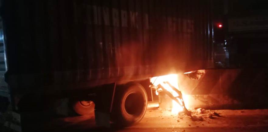 திருவள்ளூர் தாலுக்கா காவல் நிலையம் எதிரே கண்டெய்னர் லாரி தடுப்பு சுவரில் மோதி விபத்து டிசல் டேங்கர் சேதமடைந்து தீப்பிடித்து எரிந்ததால் பரபரப்பு :