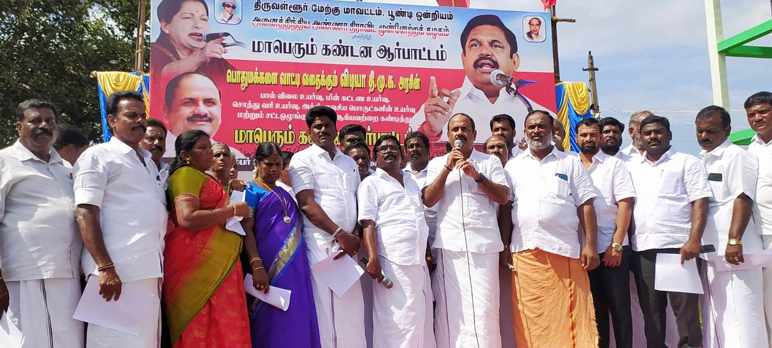 பூண்டி, கடம்பத்தூர் ஒன்றிய அதிமுக சார்பில் பால் விலை உயர்வு, மின் கட்டணை உயர்வை குறைக்க கோரி கண்டன ஆர்ப்பாட்டம் : முன்னாள் அமைச்சர் பி.வி.ரமணா பங்கேற்பு