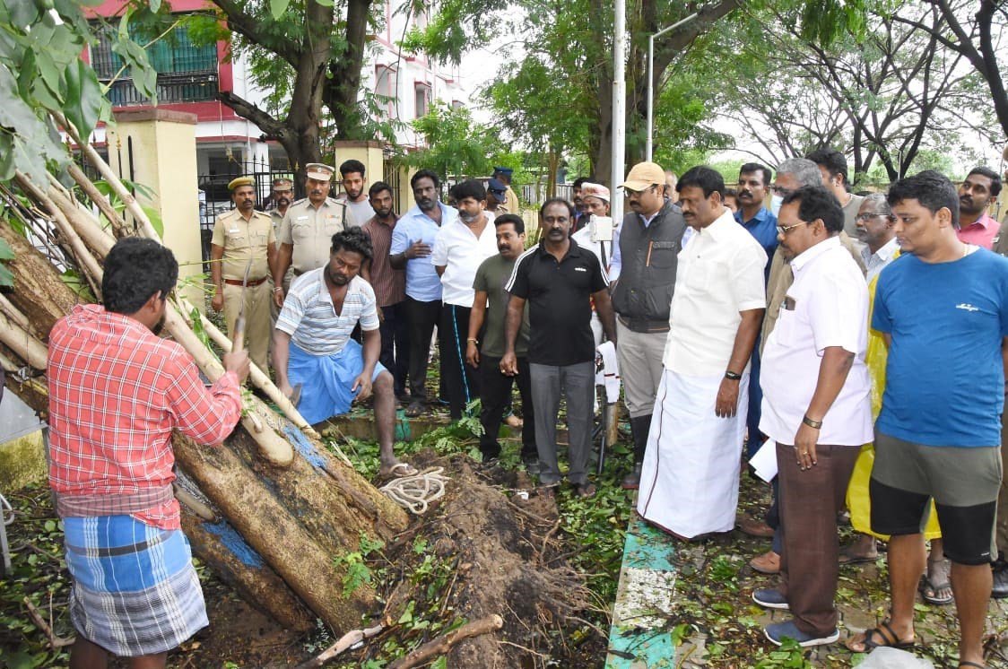 மாண்டஸ் புயல் காரணமாக பொதுமக்களுக்கு இடையூறாக புயலால் சாய்ந்த மரங்களை வெட்டி அகற்றும் பணிகள் : பால்வளத்துறை அமைச்சர் சா.மு.நாசர் நேரில் பார்வையிட்டார்