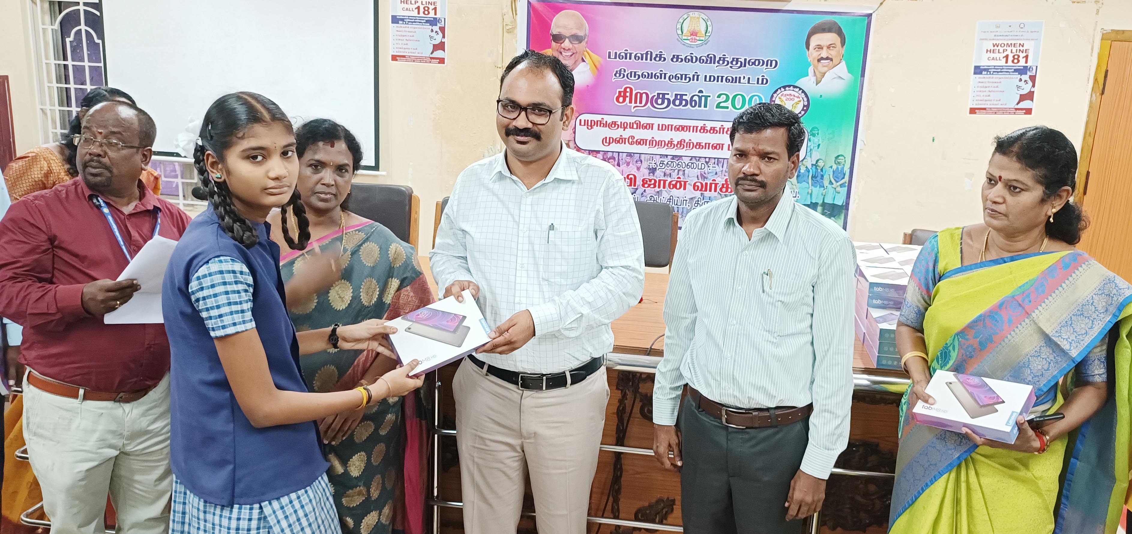 திருவள்ளூரில் "சிறகுகள் 200" என்ற திட்டத்தின் மூலம் பயன்பெற்று வரும் 100 பள்ளி மாணவ, மாணவிகளுக்கு ரூ.16 லட்சம் மதிப்பீட்டிலான இலவச கையடக்க கணினிகள் : மாவட்ட ஆட்சியர் ஆல்பி ஜான் வர்கீஸ் வழங்கினார்