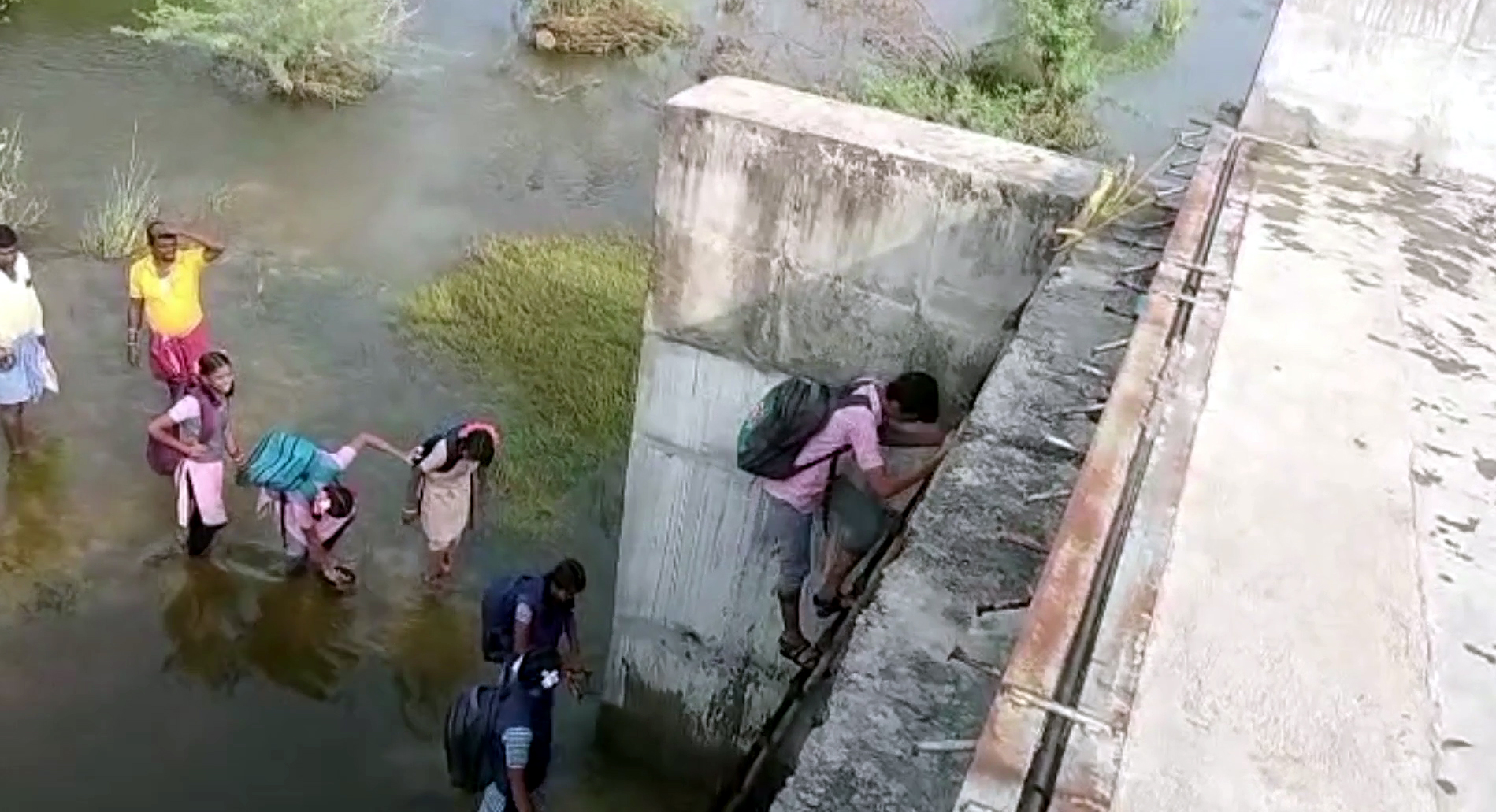 திருவள்ளூர் அருகே கொசஸ்தலை ஆற்றில் ஏற்பட்டுள்ள வெள்ளப்பெருக்கு காரணமாக மேம்பாலத்தில் ஏணியை அமைத்து அதன் மூலம் மேலே ஏறி ஆபத்தான முறையில் பள்ளிக்கு சென்று வரும் மாணவர்கள்