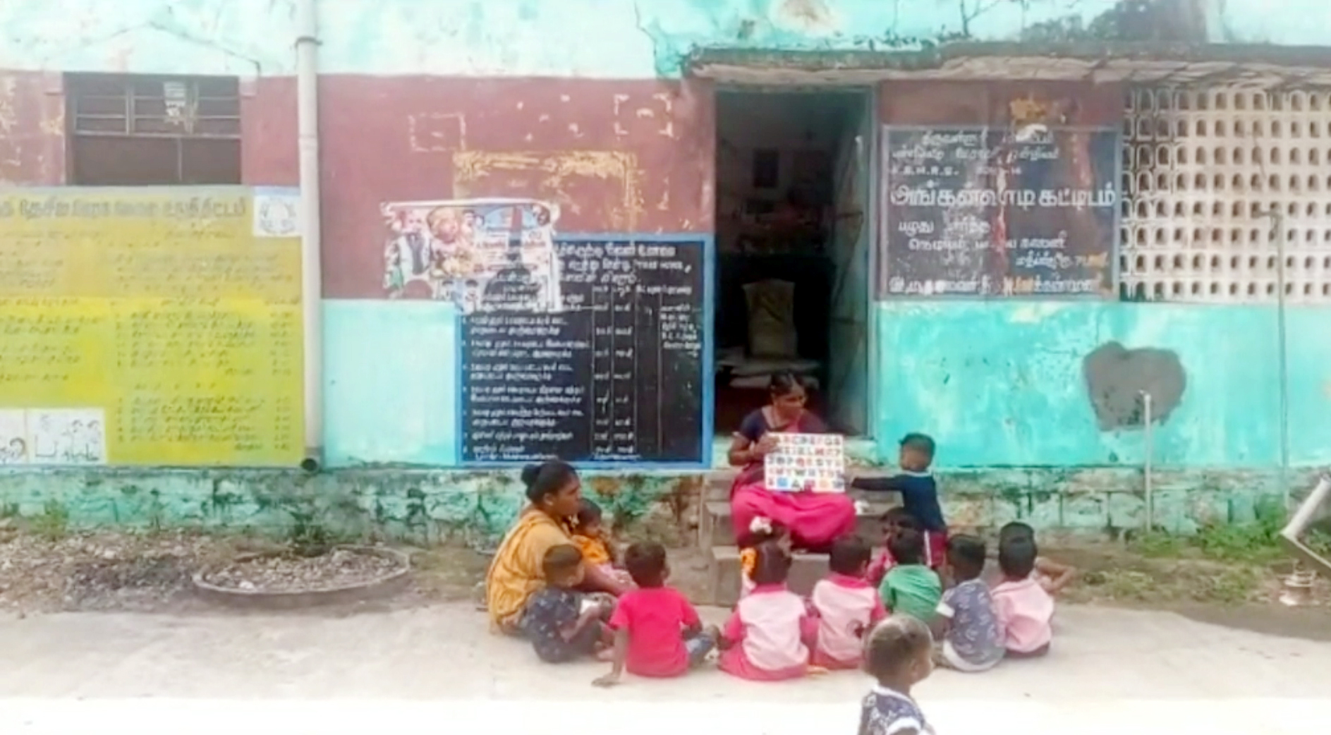 நெடியம் பழைய காலணியில் உள்ள அங்கன்வாடி கட்டிடம் மேற்கூரை சேதமடைந்து இடிந்து விழும நிலையில் இருப்பதால் குழந்தைகளை கட்டிட வாசலில் தெரு சாலையில் அமர வைத்து பாடம் நடத்தும் அவலம்