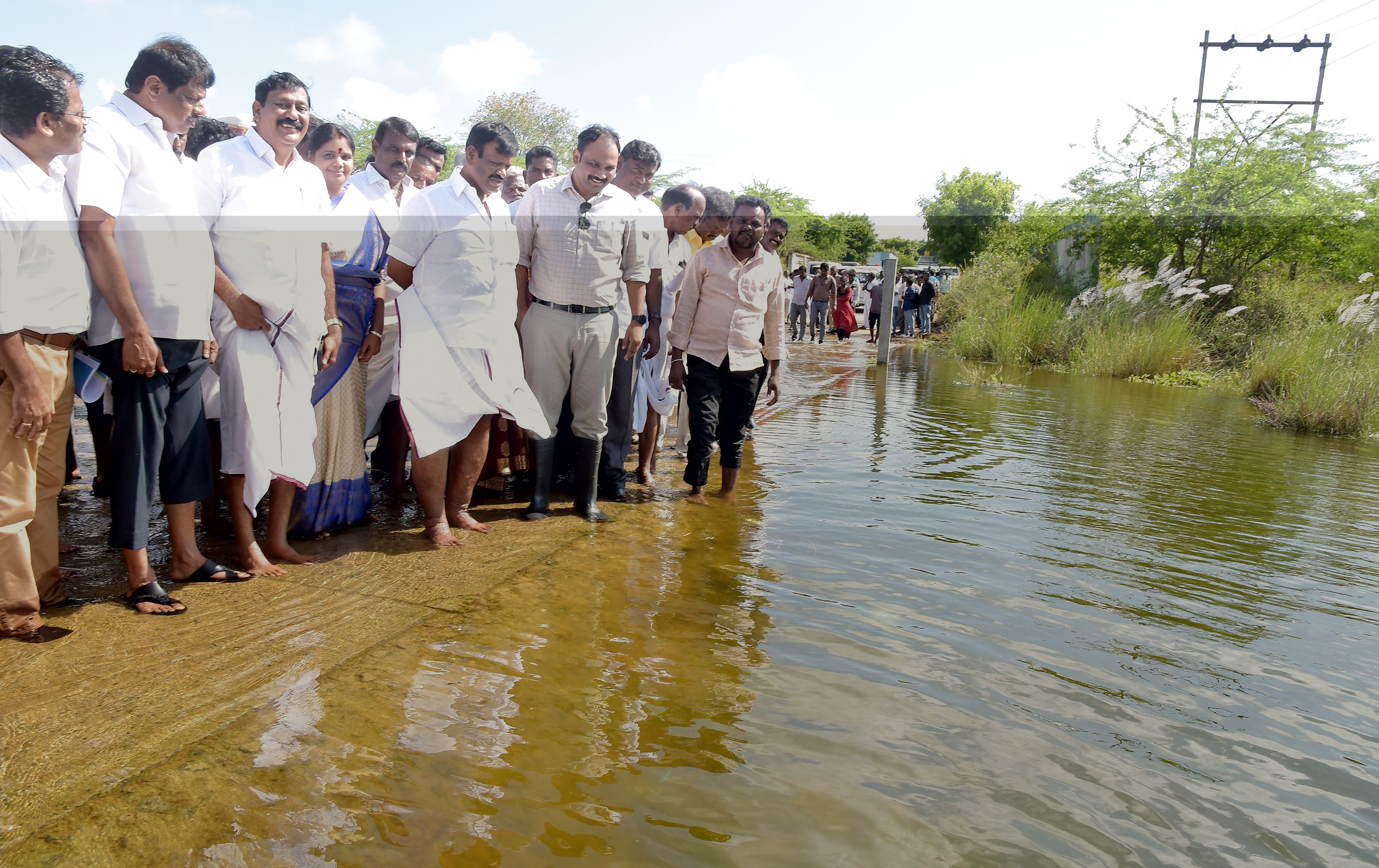 காரணி ஊராட்சி பகுதியில் ஆரணியாற்றின் குறுக்கே உள்ள தரைப்பாலத்தில் வடகிழக்கு பருவ மழை காரணமாக தண்ணீர் செல்லும் பகுதிகளை பால்வளத்துறை அமைச்சர் சா.மு.நாசர் நேரில் ஆய்வு