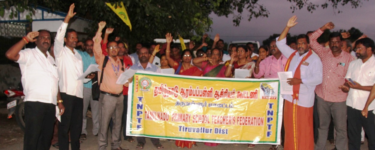 திருவள்ளூரில் தமிழ்நாடு ஆரம்பப்பள்ளி ஆசிரியர் கூட்டணியினர் 30 அம்ச கோரிக்கைகளை வலியுறுத்தி ஆர்ப்பாட்டம்
