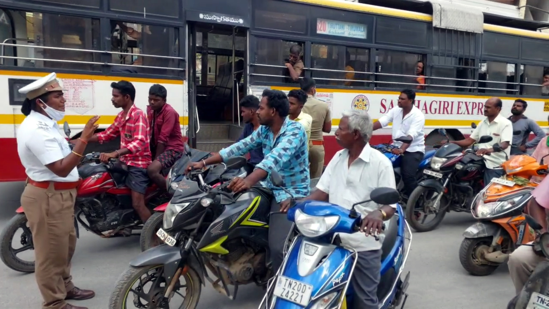 திருத்தணியில் போக்குவரத்து ஆய்வாளர் வாகன ஓட்டிகளுக்கு விதிமுறைகளை பின்பற்ற வேண்டும் என்பதை வலியுறுத்தி விழிப்புணர்வு