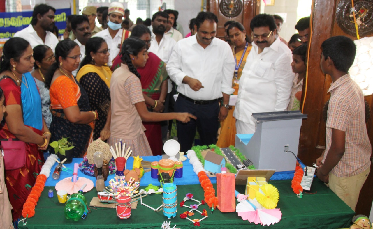 திருவள்ளூரில் பள்ளி மாணவர்களால் கழிவு பொருட்களில் இருந்து தயாரிக்கப்பட்ட விளையாட்டு பொருட்கள் கண்காட்சி : திருவள்ளூர் எம்எல்ஏ., மற்றும் மாவட்ட ஆட்சியர் ஆகியோர் பார்வையிட்டு வாழ்த்து