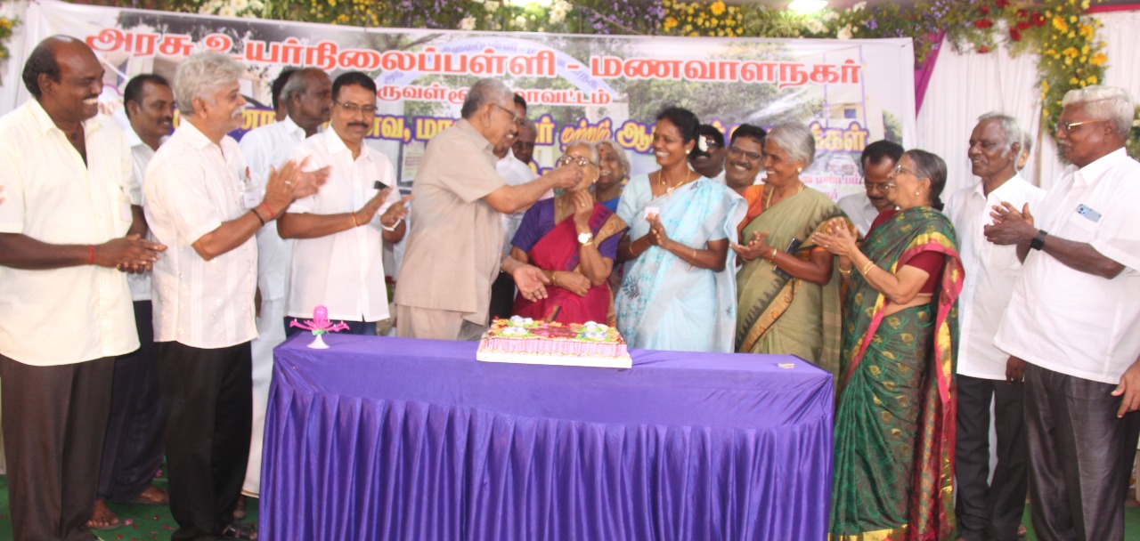 மணவாளநகரில் அரசு உயர்நிலைப் பள்ளியில் 35 ஆண்டுகளுக்கு முன்பு அரசுப் பள்ளியில் படித்த முன்னாள் மாணவர்கள் சந்திப்பு நிகழ்ச்சி : ஆசிரியர்களின் காலில் விழுந்து மாணவர்கள் ஆசி 85 வயது முன்னாள் ஆசிரியரின் பிறந்த நாளை கேக் வெட்டியும் கொண்டாடினர் :