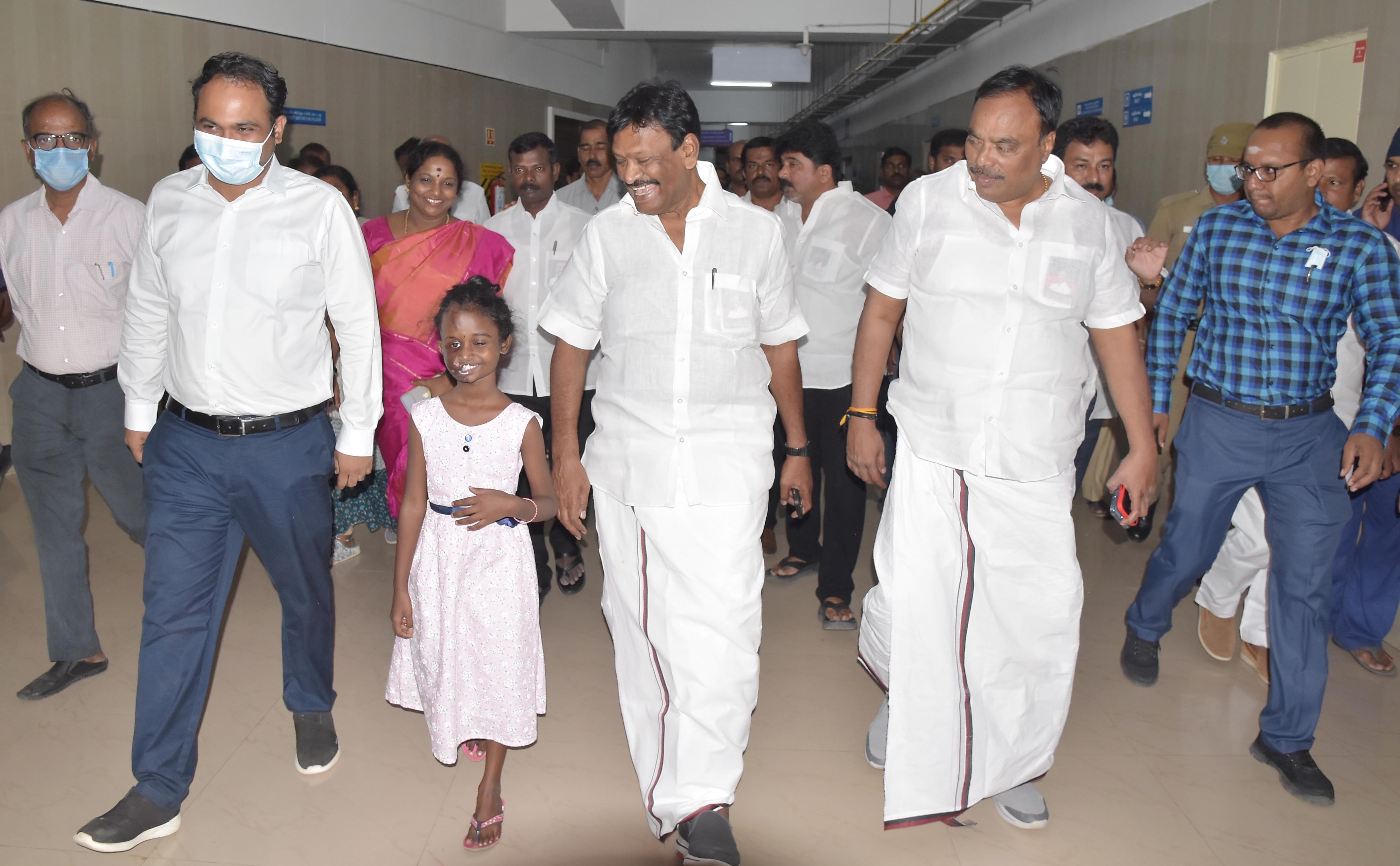 முக சிதைவு நோயால் பாதிக்கப்பட்டு குணமடைந்த டேனியா என்ற சிறுமியை பால்வளத்துறை அமைச்சர் சா.மு.நாசர் நலம் விசாரித்து வீட்டிற்கு வழியனுப்பி வைத்தார் :