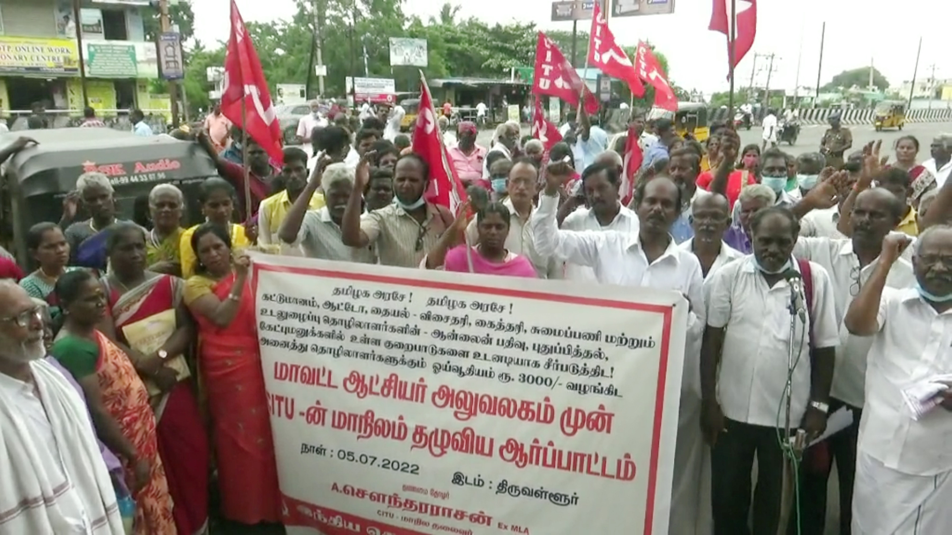 திருவள்ளூரில் நலவாரியத்தில் ஆன்லைன் மூலம் பதிவு செய்தல், புதுப்பித்தல் மற்றும் பணப்பயன்கள் பெறுவதில் உள்ள குளறுபடிகளை சீரமைக்க வேண்டும் என வலியுறுத்தி சிஐடியு சார்பில் ஆர்ப்பாட்டம்