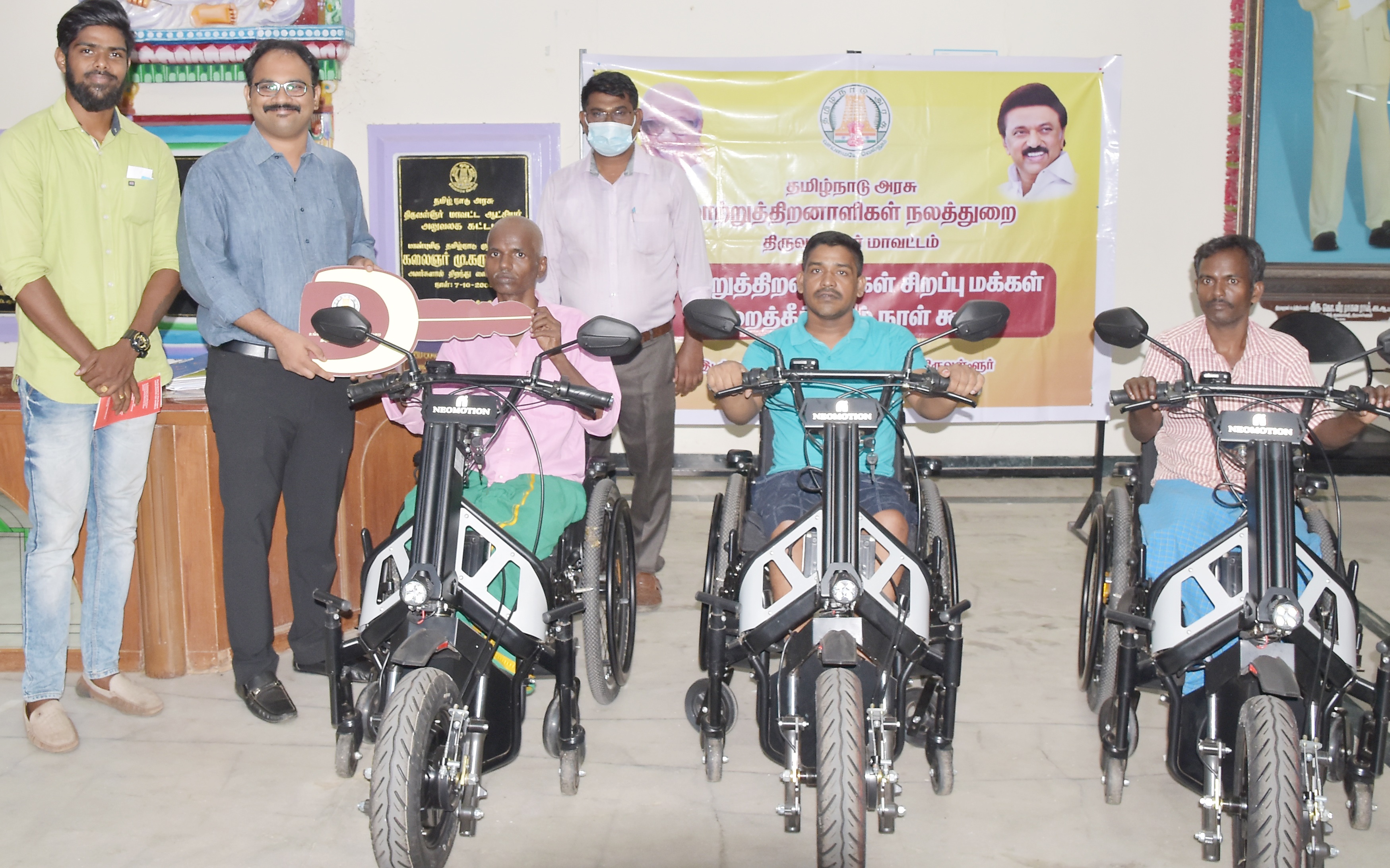 திருவள்ளூரில் மாற்றுத்திறனாளிகளுக்கான சிறப்பு குறை தீர்க்கும் நாள் கூட்டத்தில் மின்கலனால் இயங்கும் சிறப்பு சக்கர நாற்காலிகள்