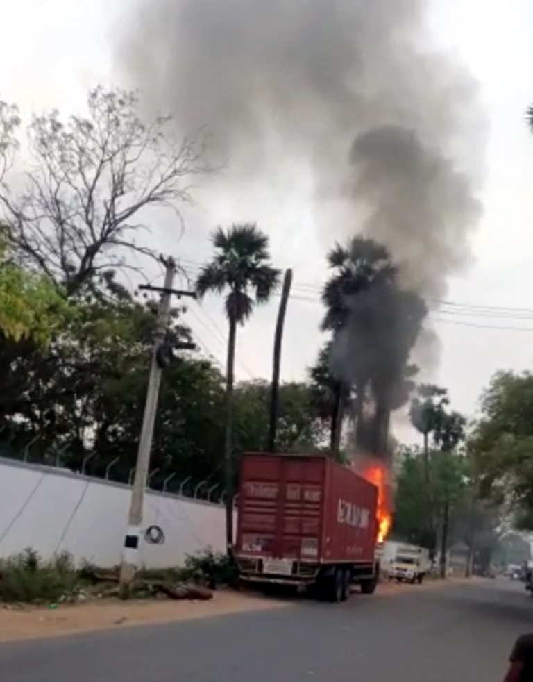 திருவள்ளூர் அருகே டயர் ஏற்றிக் கொண்டு வந்த லாரி திடீரென தீப்பற்றி எரிந்தது : பல லட்சம் மதிப்பிலான டயர் வீணானதாக தகவல்
