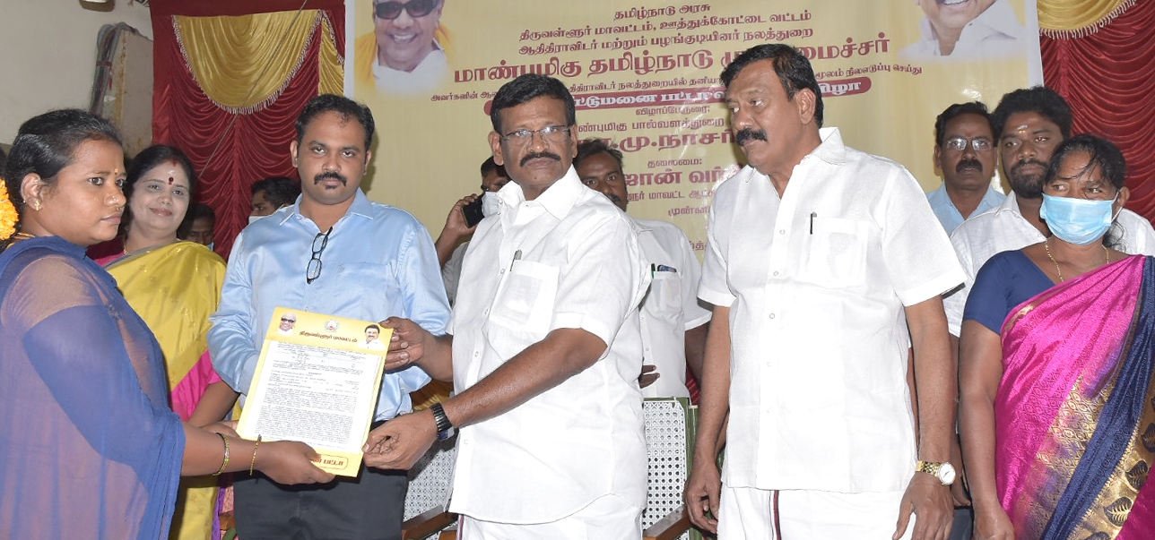 அத்தங்கிகாவனூரை சேர்ந்த 72 ஆதிதிராவிடர் பயனாளிகளுக்கு ரூ.2.16 கோடி மதிப்பீட்டில் இலவச வீட்டுமனைப் பட்டாக்கள் : பால்வளத்துறை அமைச்சர் சா.மு.நாசர் வழங்கினார்