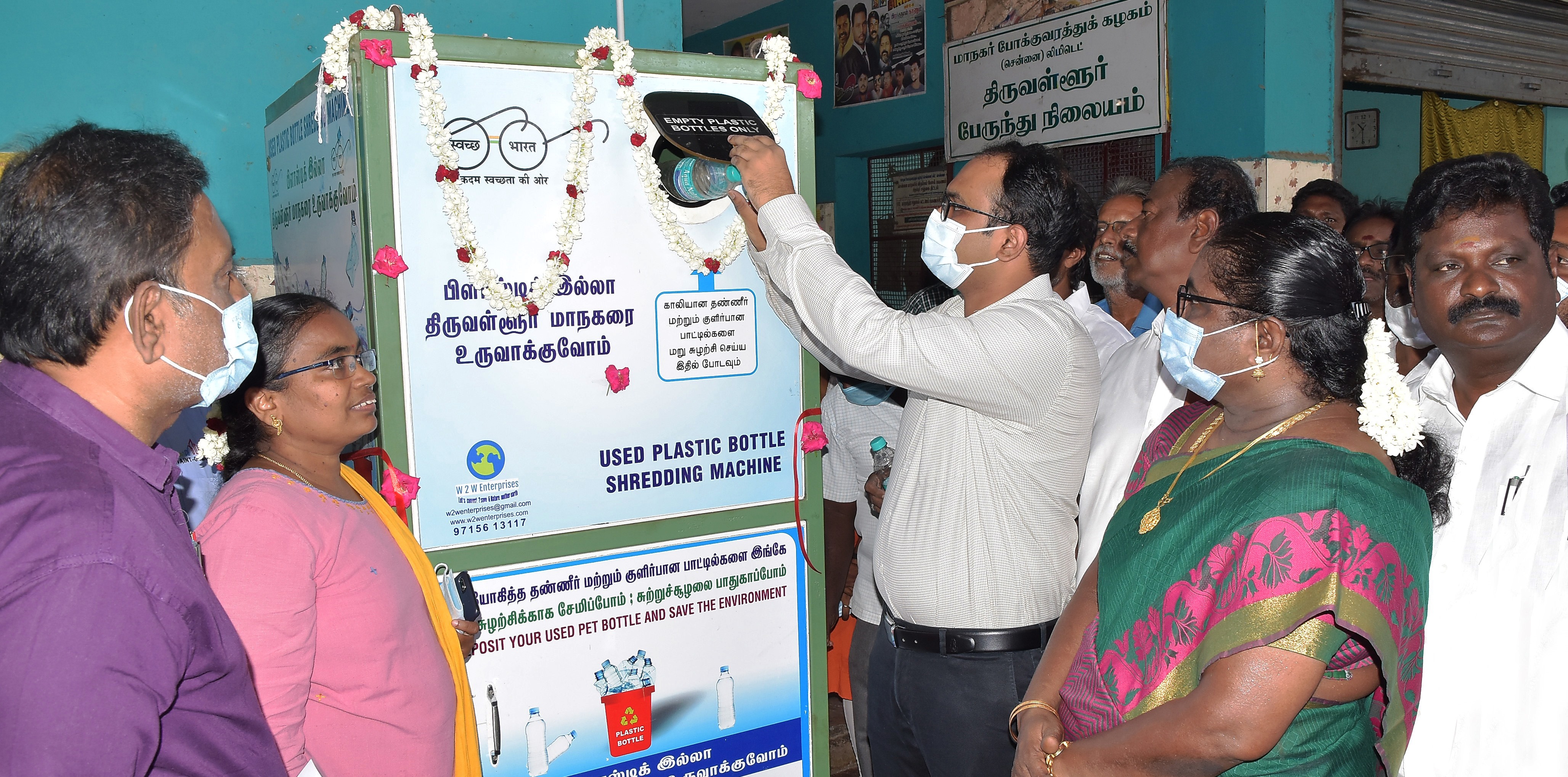திருவள்ளூர் பேருந்து நிலையத்தில் ரூ.3.25 இலட்சம் மதிப்பீட்டில் பிளாஸ்டிக் பொருட்களை மறுசுழற்சி செய்யும் இயந்திரம் : மாவட்ட ஆட்சியர் ஆல்பி ஜான் வர்கீஸ் துவக்கி வைத்தார் :