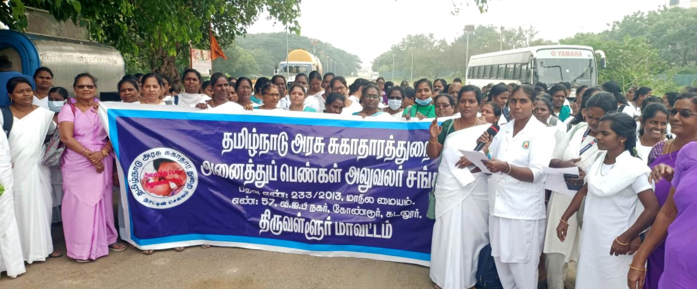 திருவள்ளூரில் கிராம, பகுதி, சமுதாய சுகாதார செவிலியர் சங்கங்களின் கூட்டு நடவடிக்கை குழு சார்பில் காலிப் பணியிடங்களை நிரப்புதல் உள்ளிட்ட பல்வேறு கோரிக்கைகளை வலியுறுத்தி செவிலியர்கள் ஆர்ப்பாட்டம் :
