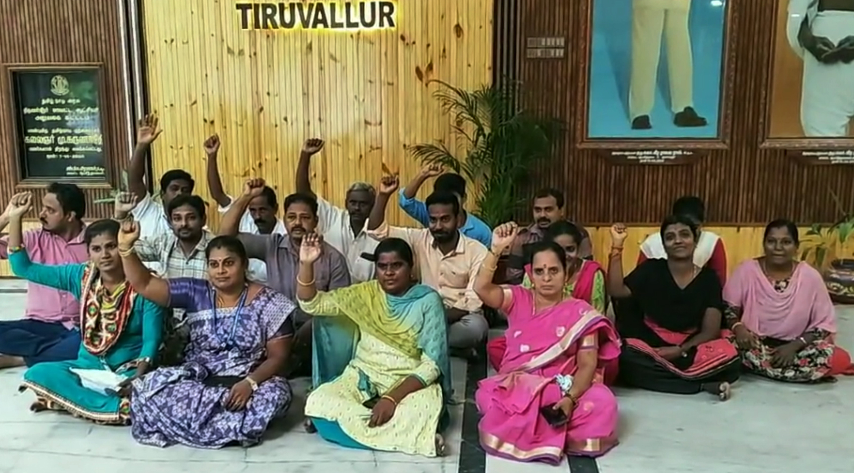 திருவள்ளூரில் திமுக அரசின் திட்டங்களை செயல்படுத்துவதில் பணிச்சுமை அதிகம் உண்டாவதாக தமிழ்நாடு வருவாய்த்துறை அலுவலர்கள் சங்கம் சார்பில் பணிகள் புறக்கணிப்பு காத்திருப்பு போராட்டம் :