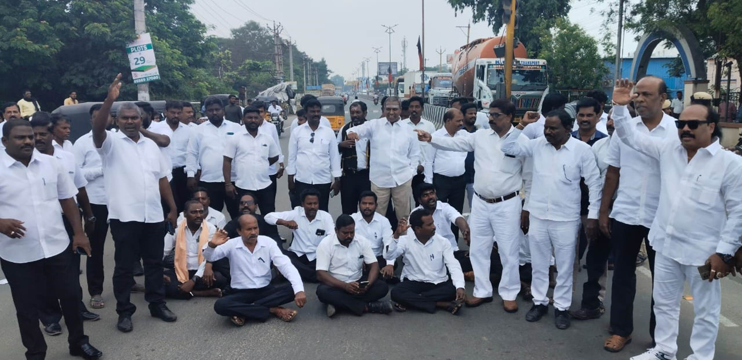 ஓசூர் நீதிமன்ற வளாகத்தில் வழக்கறிஞர் வெட்டப்பட்டதை கண்டித்து திருவள்ளூர் ஒருங்கிணைந்த நீதிமன்ற வழக்கறிஞர்கள் நீதிமன்ற புறக்கணிப்பு போராட்டம் : சென்னை திருப்பதி தேசிய நெடுஞ்சாலையில் அமர்ந்து சாலை மறியல் :