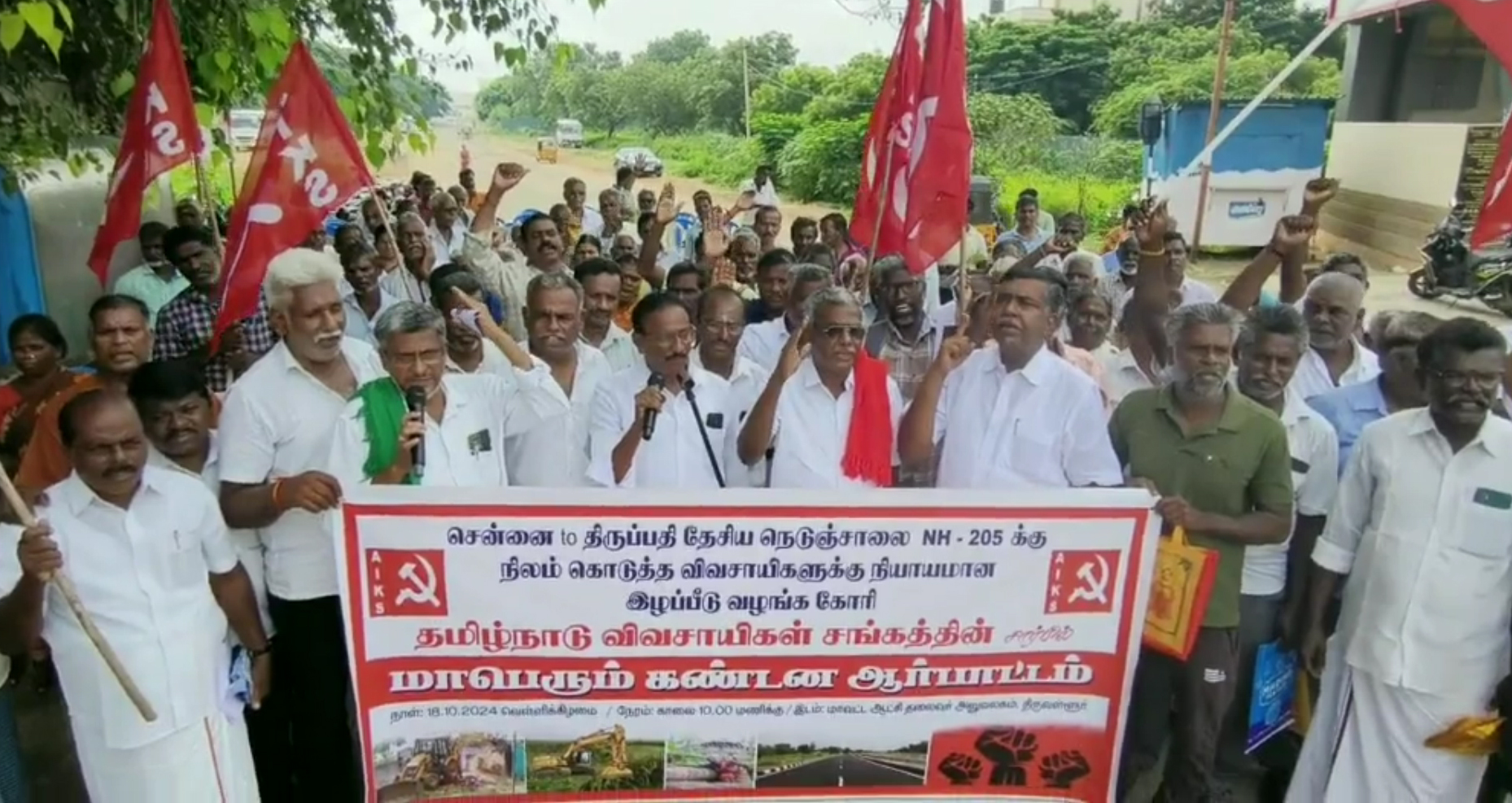 சென்னை -திருப்பதி தேசிய நெடுஞ்சாலைக்கு நிலங்களை வழங்கிய விவசாயிகளுக்கு நிலம் கையகப்படுத்தல் மற்றும் நியாயமான இழப்பீடு சட்டத்தின் கீழ் இழப்பீடு வழங்க வேண்டும் என தமிழ்நாடு விவசாயிகள் சங்கம் சார்பில் ஆர்ப்பாட்டம் :