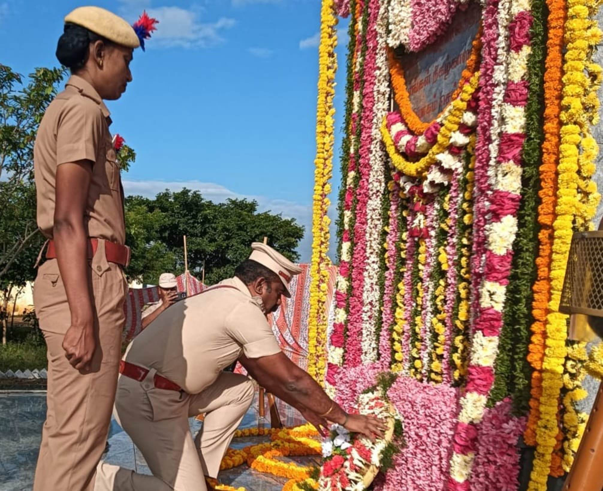 திருவள்ளூரில் வீரவணக்க நாளை முன்னிட்டு நினைவுத் தூணுக்கு மாவட்ட எஸ் பி மலர் வளையம் வைத்து அஞ்சலி :