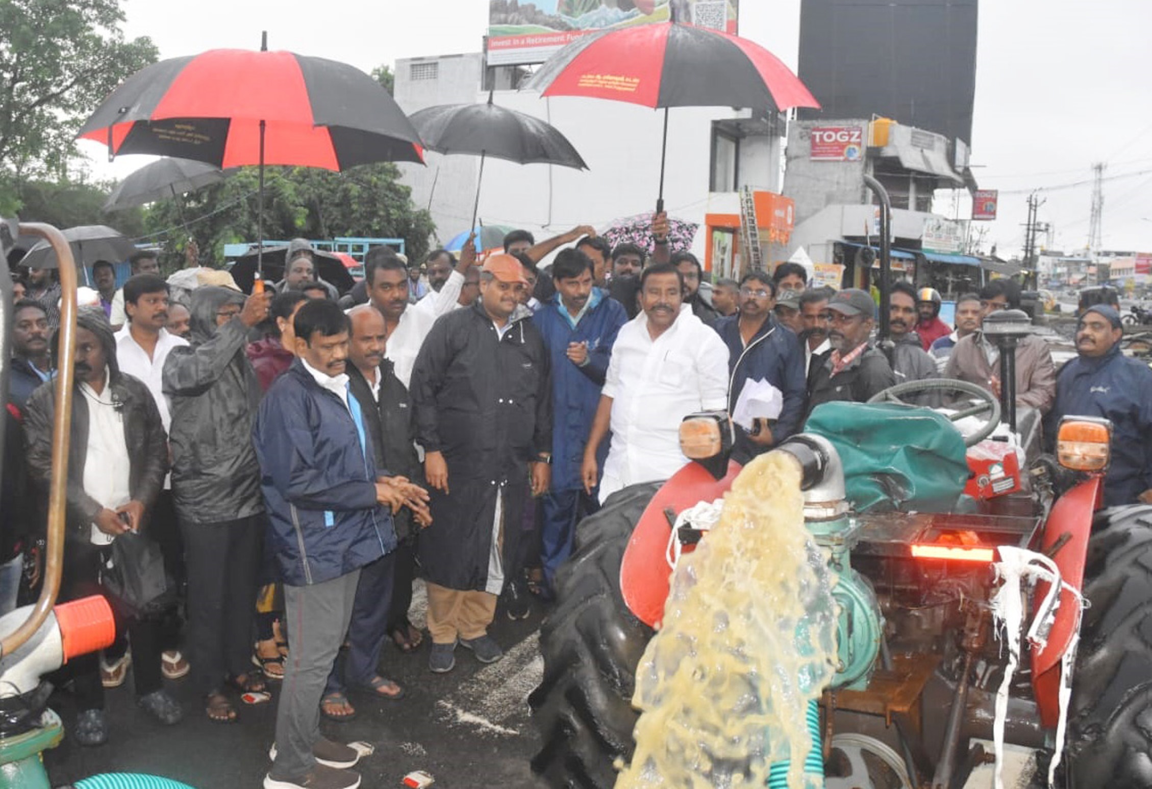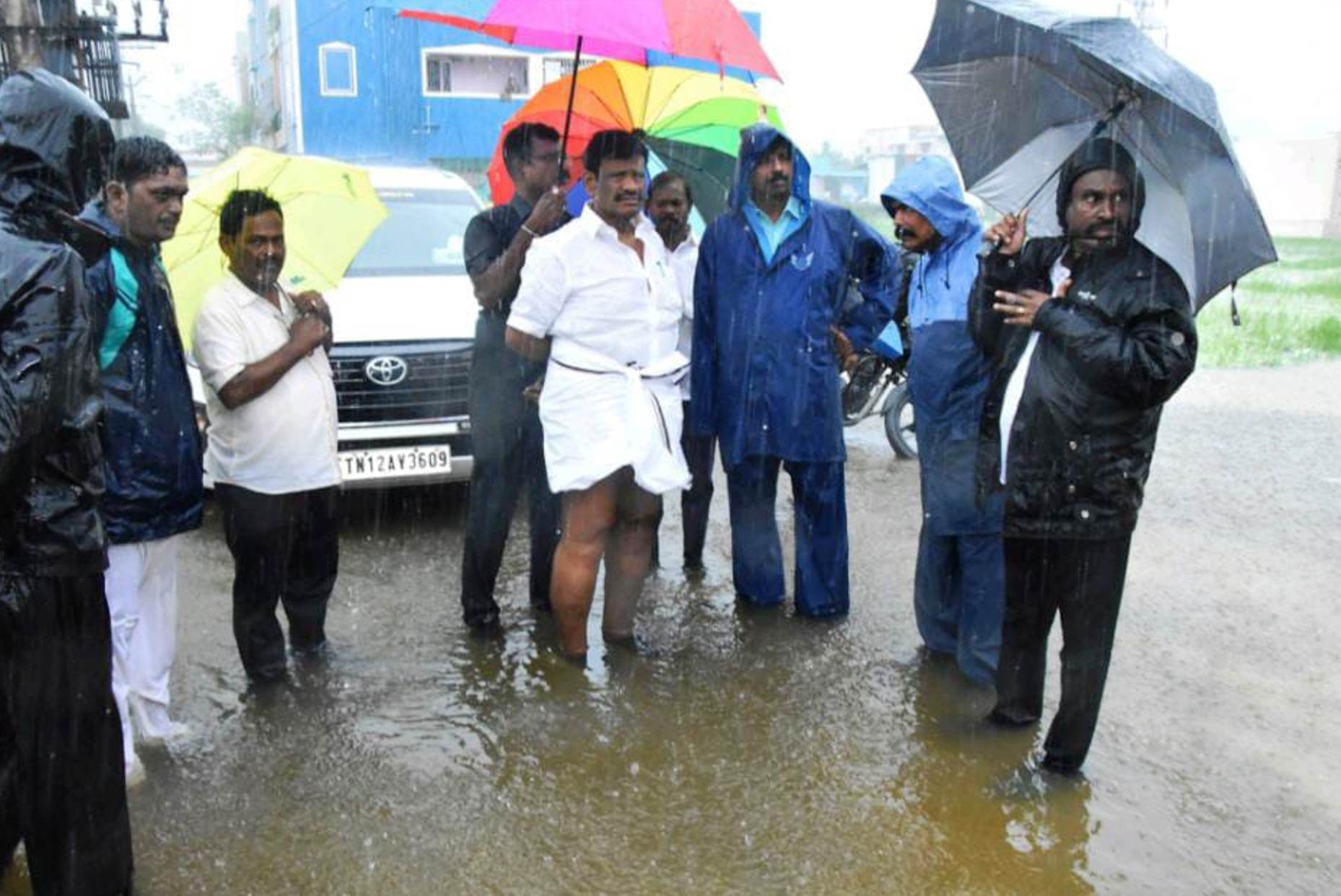வடகிழக்கு பருவமழை கனமழையால் வெள்ளம் சூழ்ந்துள்ள பகுதிகளில் மழைநீரினை வெளியேற்றும் பணியை நகர்ப்புற உள்ளாட்சித் துறை அமைச்சர் கே. என். நேரு பார்வையிட்டு ஆய்வு :