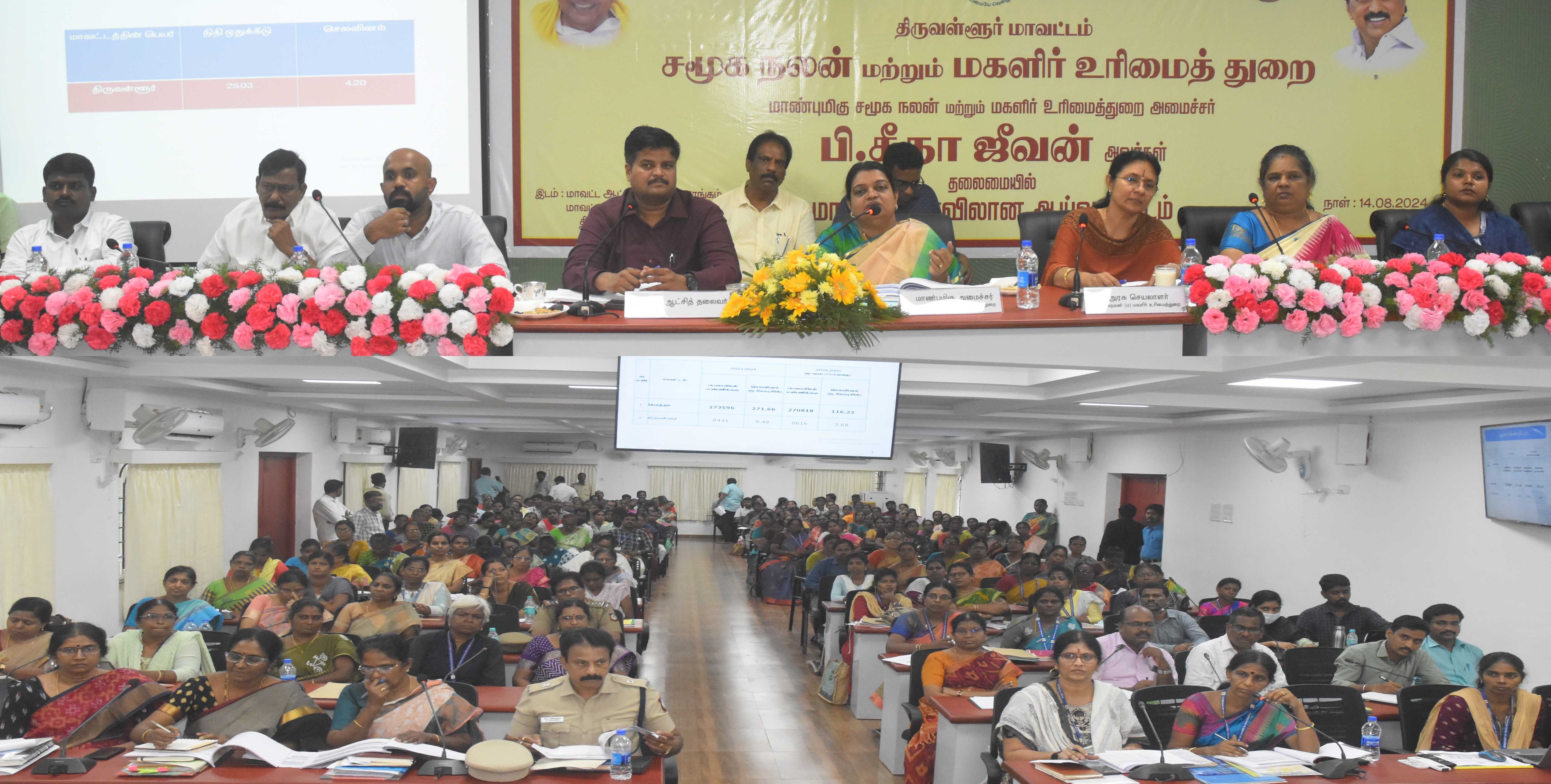 திருவள்ளூர் மாவட்டத்தில் திட்டப்பணிகள், முன்னேற்றம் மற்றும் செயல்பாடுகள் குறித்து சமூக நலன் மகளிர் உரிமைத்துறை அமைச்சர் பி.கீதா ஜீவன் மாவட்ட அலுவலர்களுடன் ஆய்வு கூட்டம் :