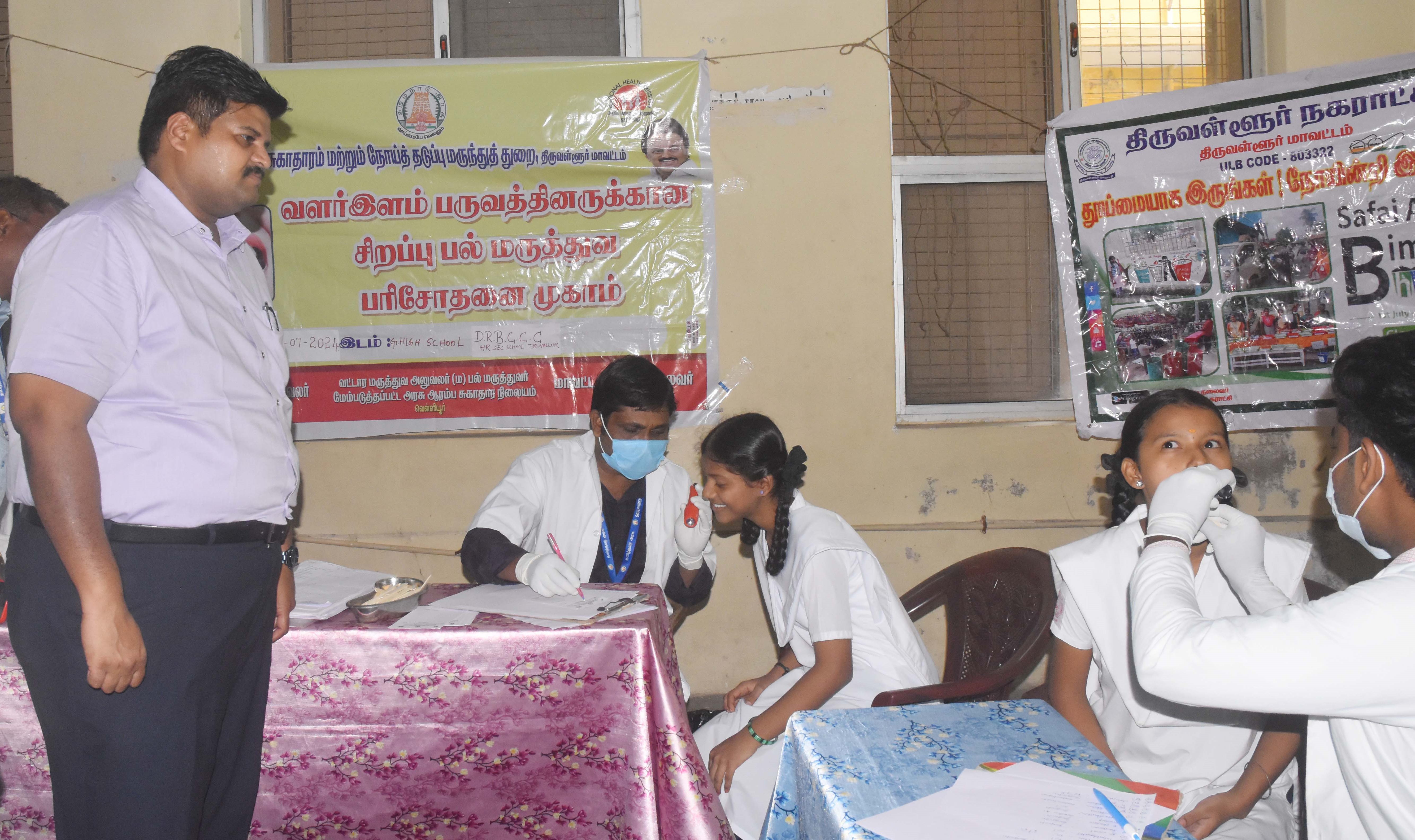திருவள்ளூர் மாவட்டத்தில் 249 அரசு மற்றும் அரசு உதவிபெறும் உயர்நிலை, மேல்நிலைப் பள்ளிகளில் மாணவ மாணவிகளுக்கு சிறப்பு பல் மருத்துவ பரிசோதனை முகாம் : மாவட்ட ஆட்சியர் த. பிரபு சங்கர் துவக்கி வைத்தார் :