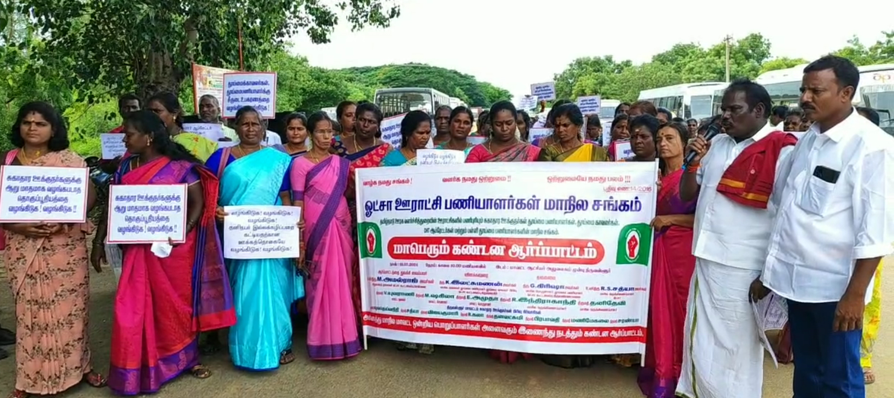 திருவள்ளூரில் 12 அம்ச கோரிக்கைகளை வலியுறுத்தி ஓட்சா ஊராட்சி பணியாளர் கூட்டமைப்பினர் ஆர்ப்பாட்டம் :