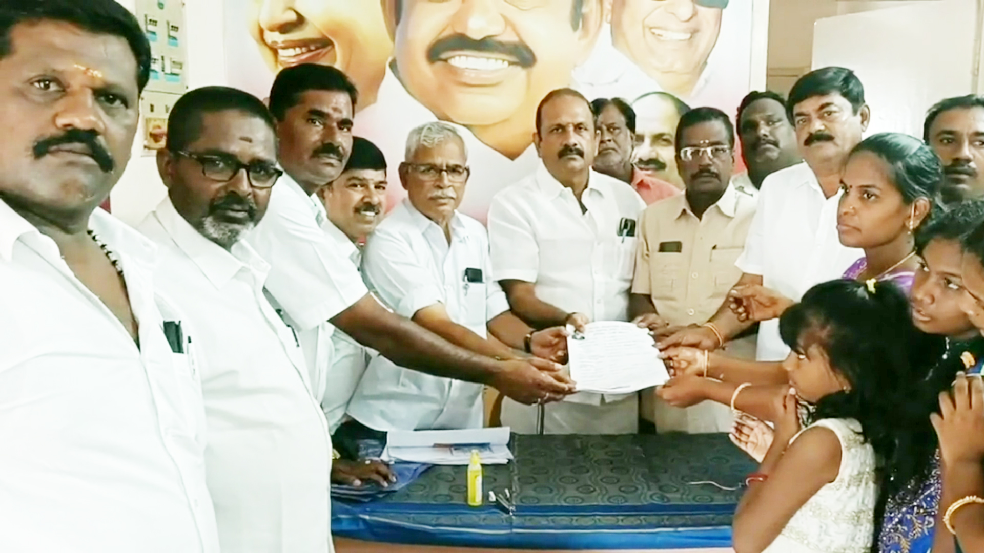 அண்ணா தொழிற்சங்க பேரவை சார்பில் நலிவுற்ற தொழிலாளர்களுக்கு நலத்திட்ட உதவிகள் வழங்குவதற்கான விண்ணப்பங்களை முன்னாள் அமைச்சர் பி.வி.ரமணாவிடம் வழங்கினர் :