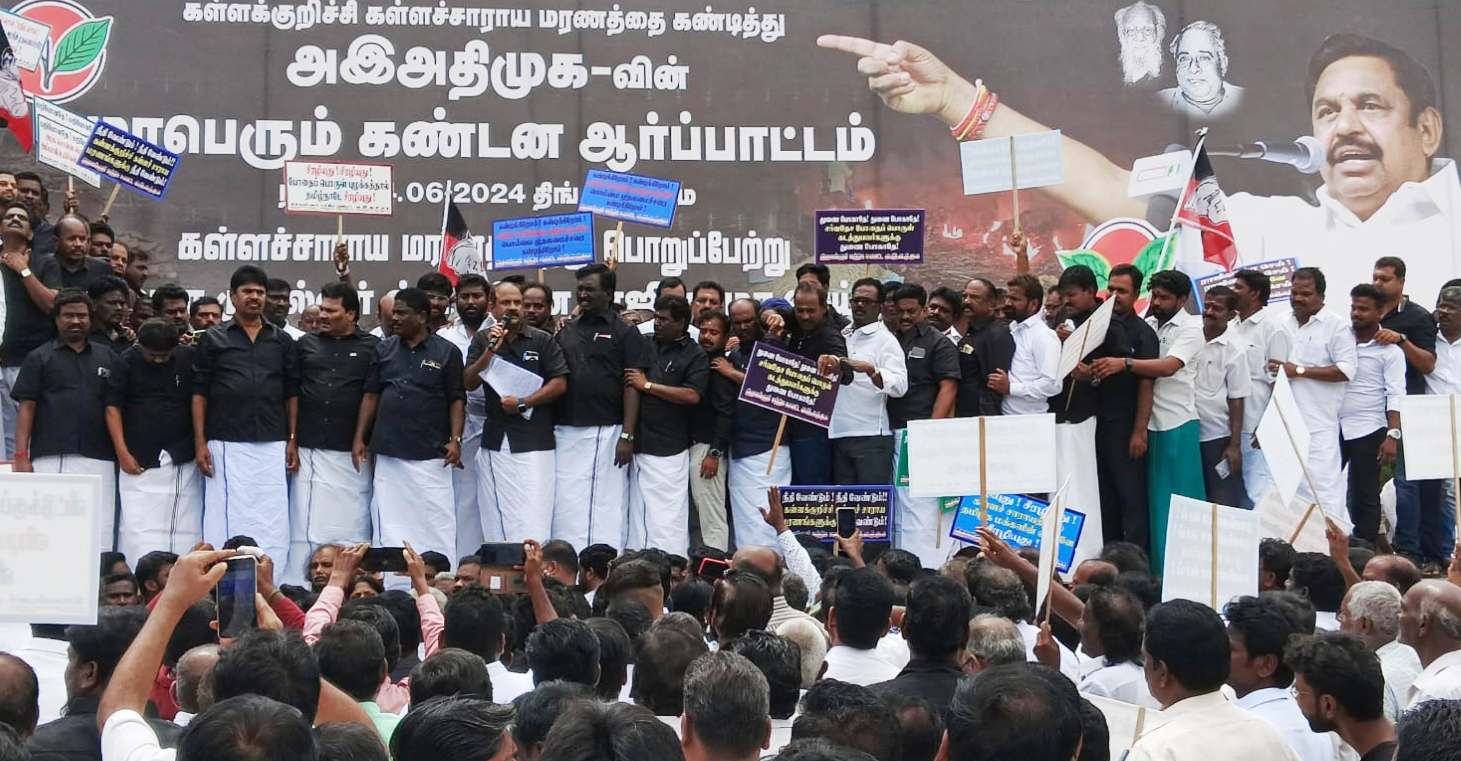 மேடைக்கு பதில் லாரியில் நின்று ஆர்ப்பாட்டம் செய்ய எதிர்ப்பு : கள்ளக்குறிச்சியில் கள்ளச்சாராயம் குடித்து 62 பேர் உயிரிழந்தததற்கு பொறுப்பேற்று திமுக அரசு பதவி விலக வேண்டும் என்பதை வலியுறுத்தி திமுக அரசைக் கண்டித்து திருவள்ளூரில் அதிமுக சார்பில் கண்டன ஆர்ப்பாட்டம் :