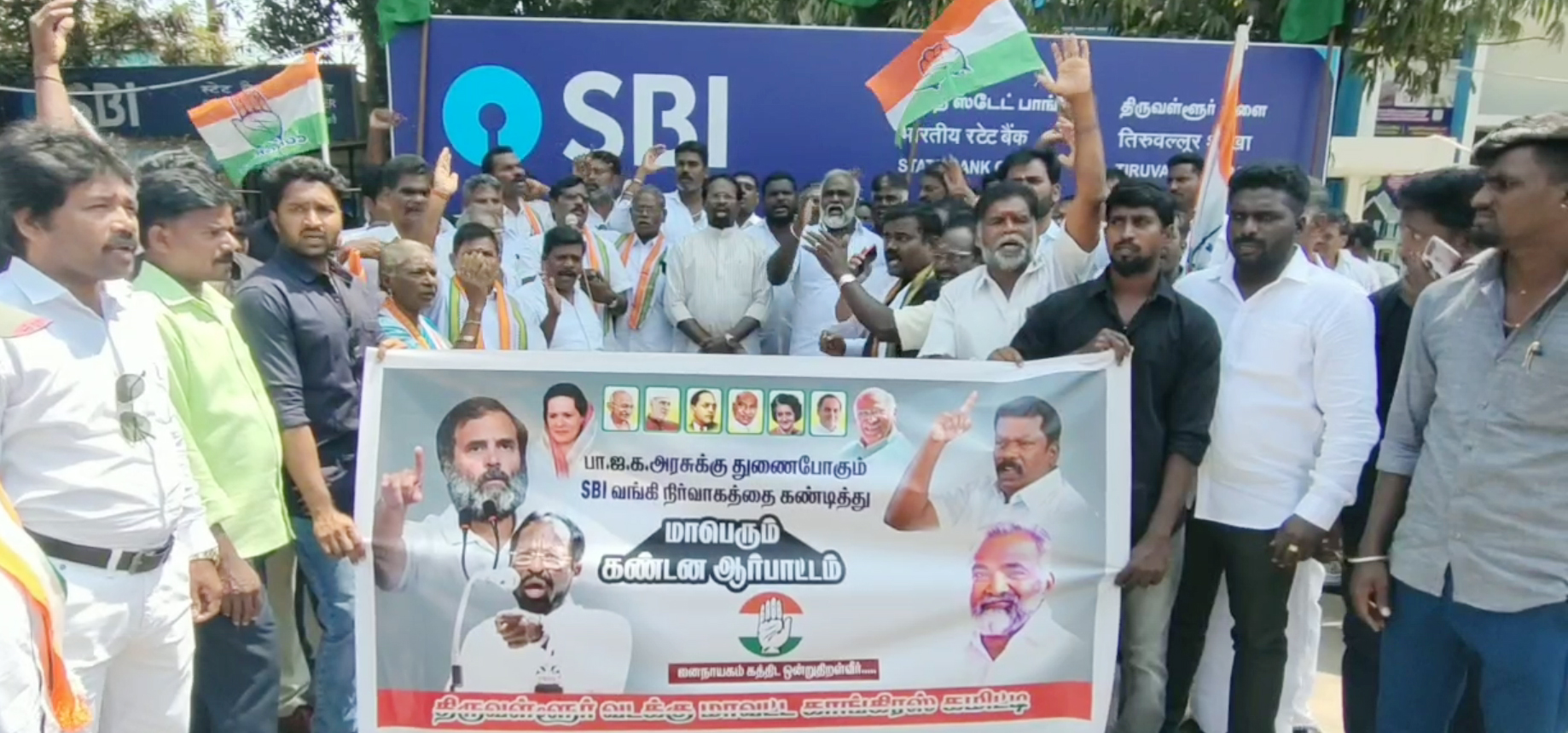 திருவள்ளூர் எஸ்பிஐ வங்கி அருகில் பாஜக அரசுக்கு துணை போகும் எஸ்பிஐ வங்கியை கண்டித்து திருவள்ளூர் வடக்கு மாவட்ட காங்கிரஸ் கட்சி சார்பில் கண்டன ஆர்ப்பாட்டம் :