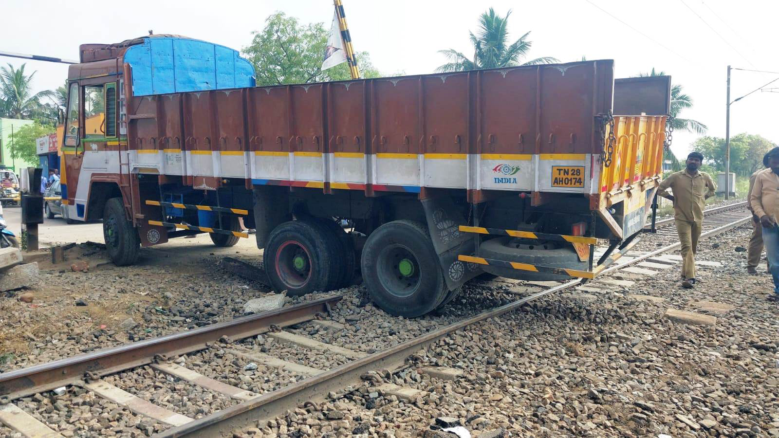 ரயில் இரும்பு பாதையை கடக்கும் முயன்ற லாரி இரும்புப் பாதையில் சிக்கியதால் சென்னை நோக்கி செல்லக்கூடிய ரயில்கள் தாமதம் :