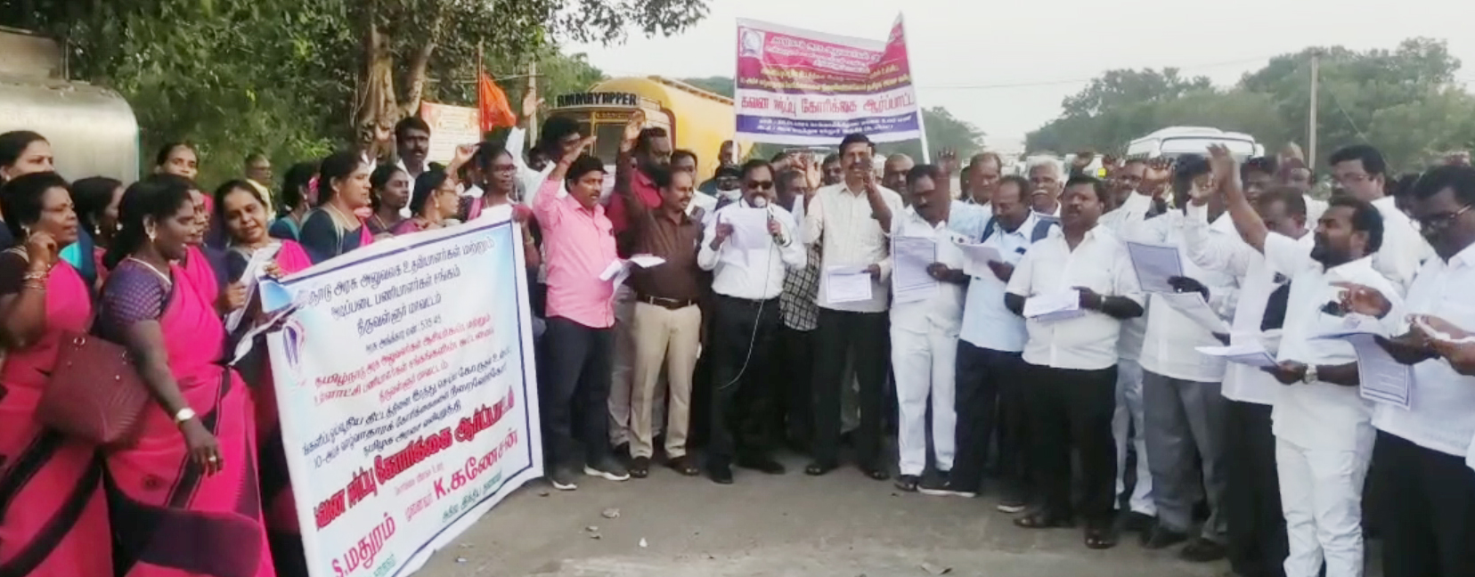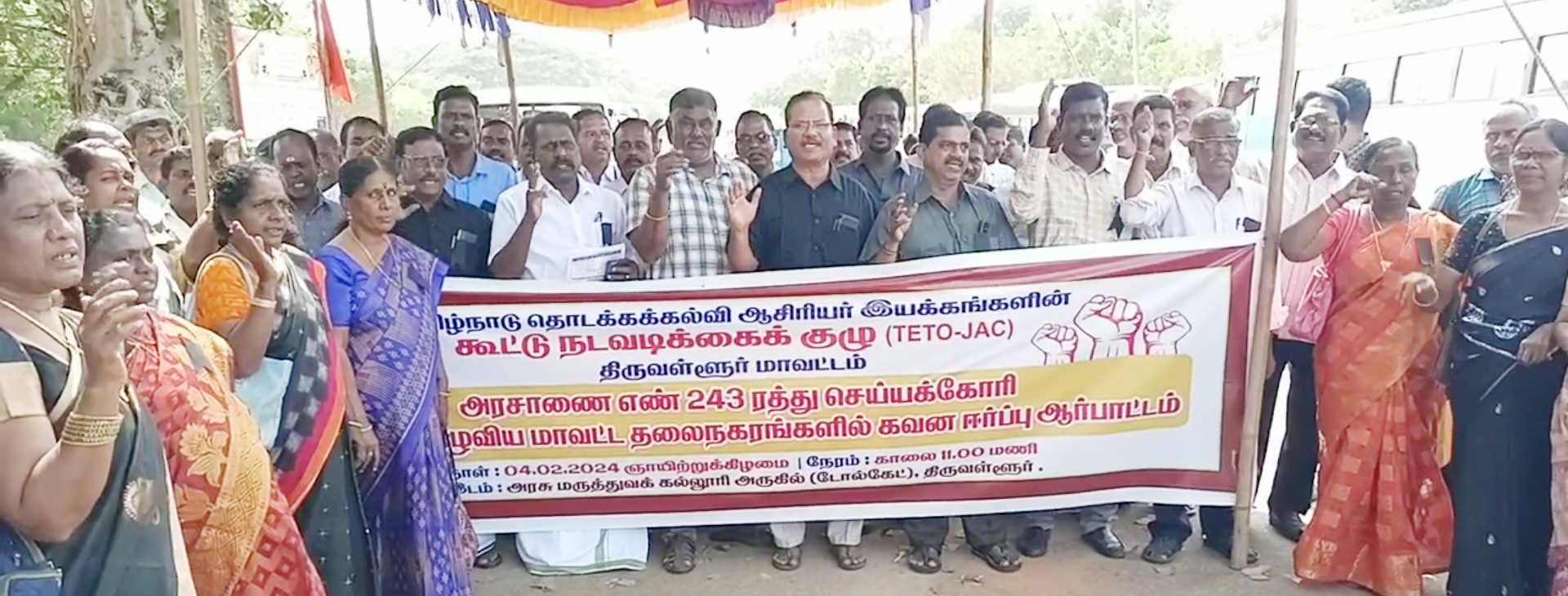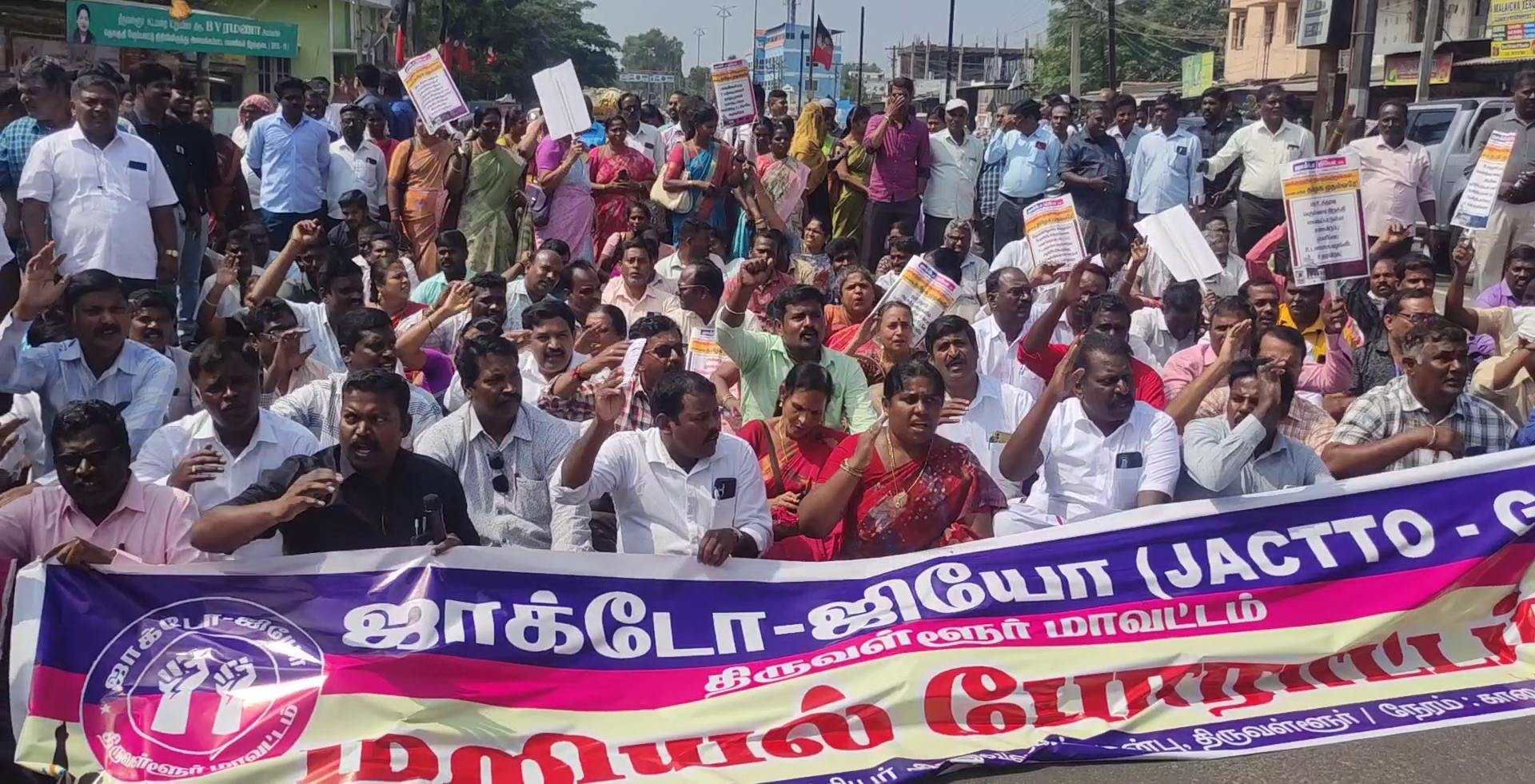 ஜாக்டோ ஜியோ சார்பில் பல்வேறு கோரிக்கைகளை வலியுறுத்தி திருவள்ளூர் மாவட்ட கலெக்டர் அலுவலகம் எதிரில் ஆர்பாபாட்டம் மற்றும் சாலை மறியல் போராட்டம் :