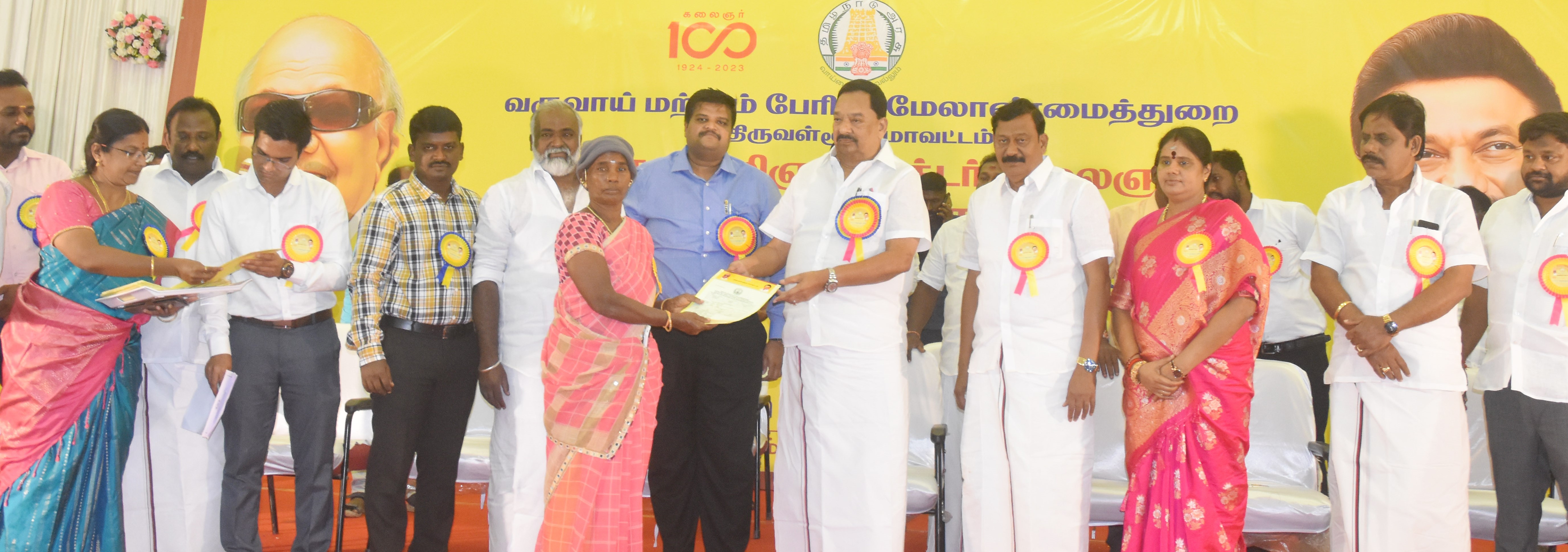 முத்தமிழறிஞர் டாக்டர் கலைஞர் நூற்றாண்டு விழாவை முன்னிட்டு மீஞ்சூர் பகுதியில் பட்டா வழங்கும் சிறப்பு முகாமில் 2973 பட்டாக்கள் : கைத்தறி மற்றும் துணிநூல் துறை அமைச்சர் ஆர்.காந்தி வழங்கினார் :