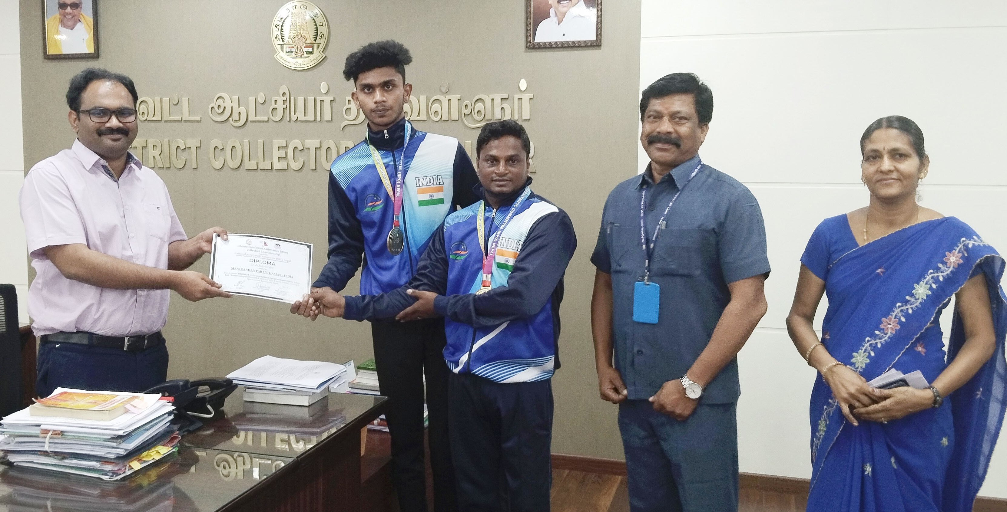 திருவள்ளூர் மாவட்ட ஆட்சியர் அலுவலகத்தில் தேசிய பாராலிம்பிக் குழு மூலமாக கடந்த 10,11 ஆகிய தேதிகளில் நேபாளில் நடைபெற்ற சர்வதேச ஓபன் காத்மண்ட் சிட்டிங் வாலிபால் சாம்பியன்ஷிப் போட்டி