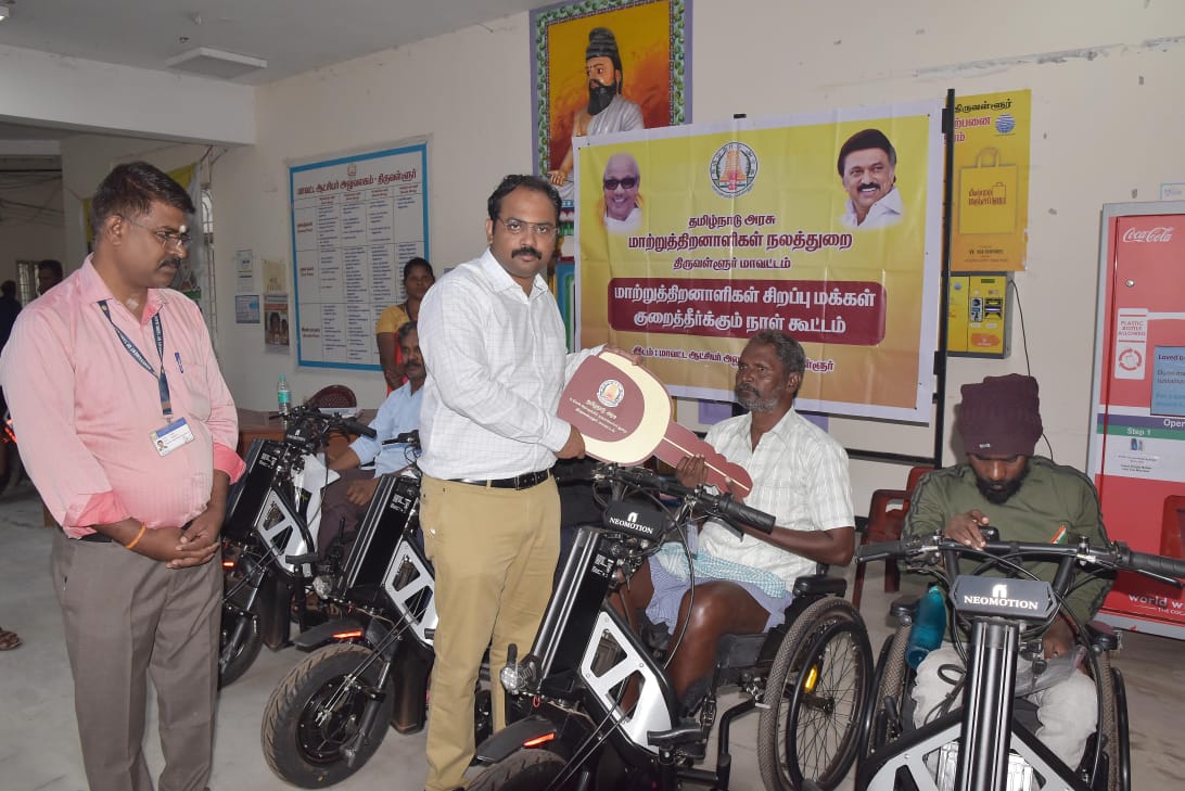 திருவள்ளூர் மாவட்டத்தில் மின்கலனால் இயங்கும் சிறப்பு சக்கர நாற்காலி வழங்கி எங்களது வாழ்வை காத்த தமிழ்நாடு முதலமைச்சர் மு.க.ஸ்டாலின் அவர்களுக்கு தங்களது நெஞ்சார்ந்த நன்றியை தெரிவித்துக் கொண்டனர் :