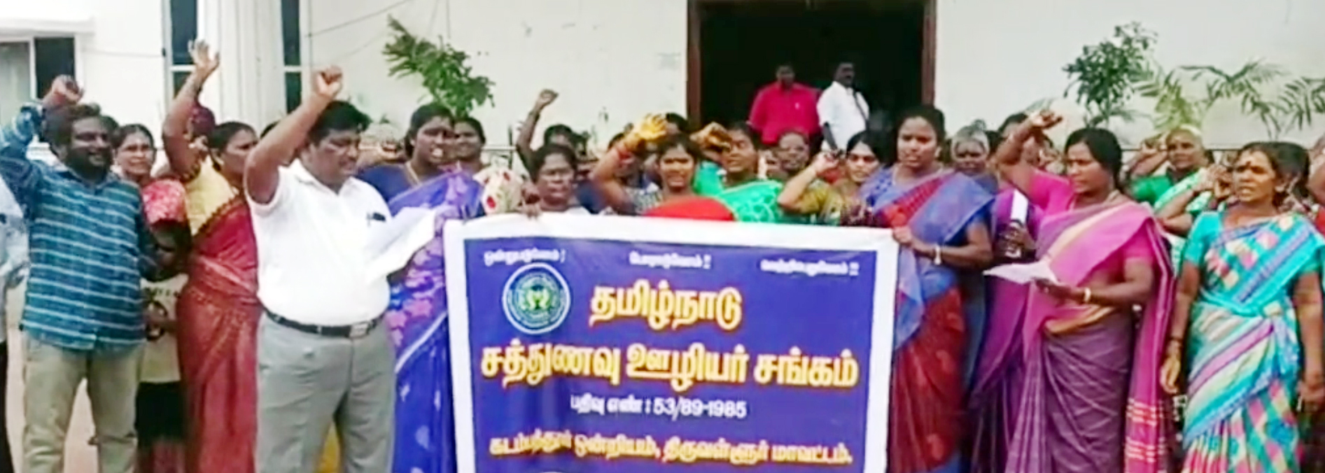 கடம்பத்தூரில் தமிழ்நாடு சத்துணவு ஊழியர் சங்கம் சார்பில் உணவு திட்டத்தை சத்துணவு ஊழியர் கொண்டு செயல்படுத்த வேண்டி முதல்வரின் கவன ஈர்ப்பு ஆர்ப்பாட்டம்